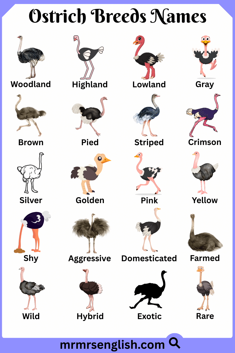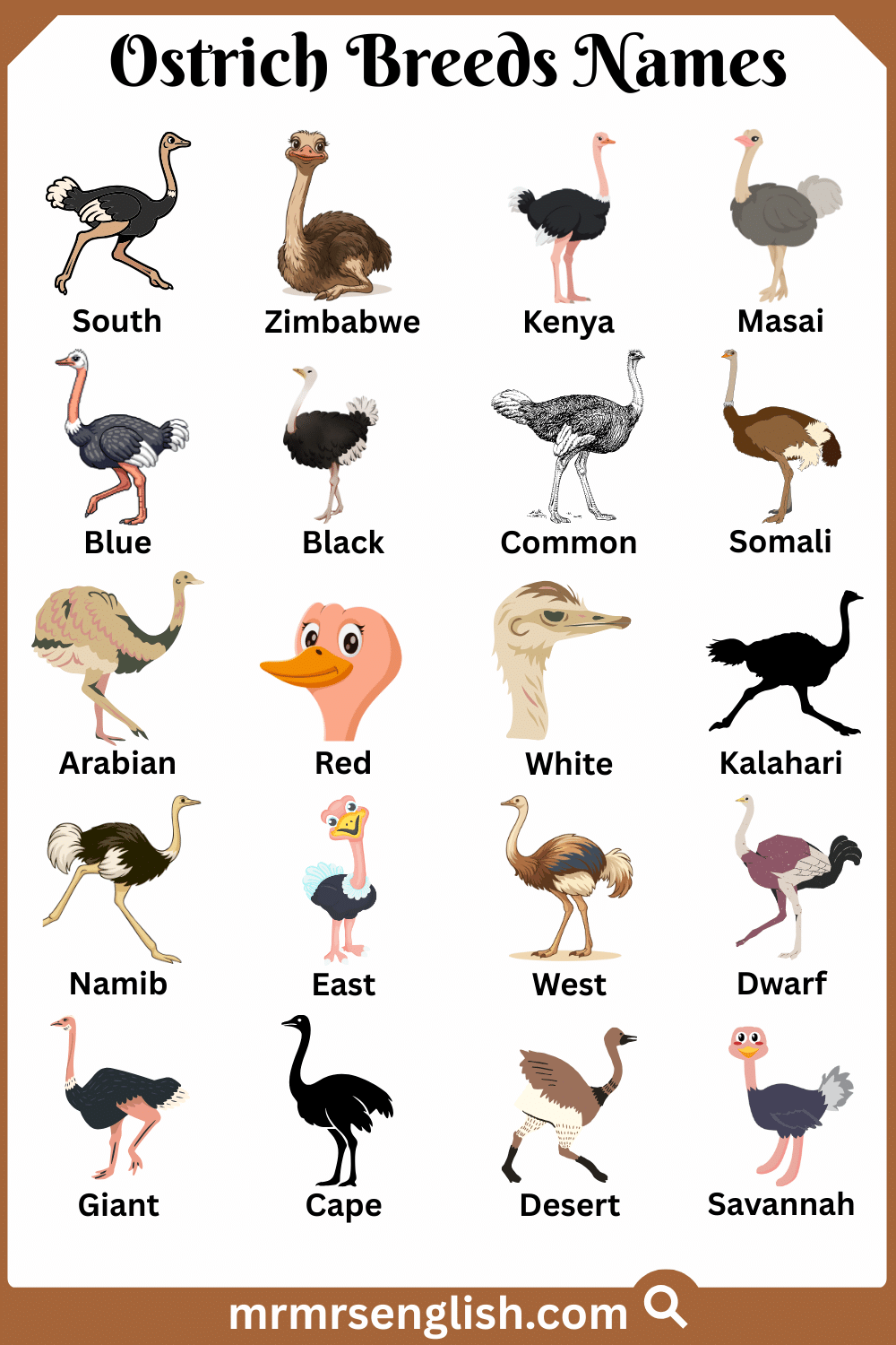 Ostriches are the largest birds in the world and are known for their strong legs, fast running speed, and unique appearance. Different ostrich breeds are found in various regions and are raised for farming, research, and learning purposes. Knowing the names of ostrich breeds in English helps students and learners understand animal classification and basic zoology. In this article, you will learn common Ostrich Breeds Names in English with Their Pictures to help you identify each breed correctly.