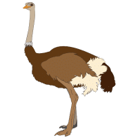 Brown ostrich; common in savannas, medium-large size, social, calm, hardy, strong runner, raised for meat, feathers, and leather.