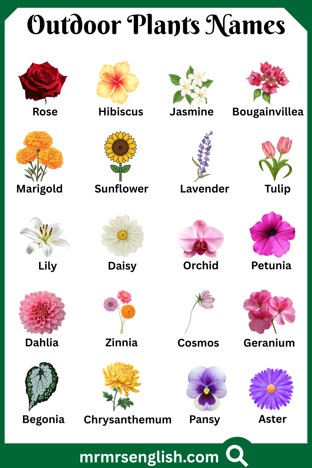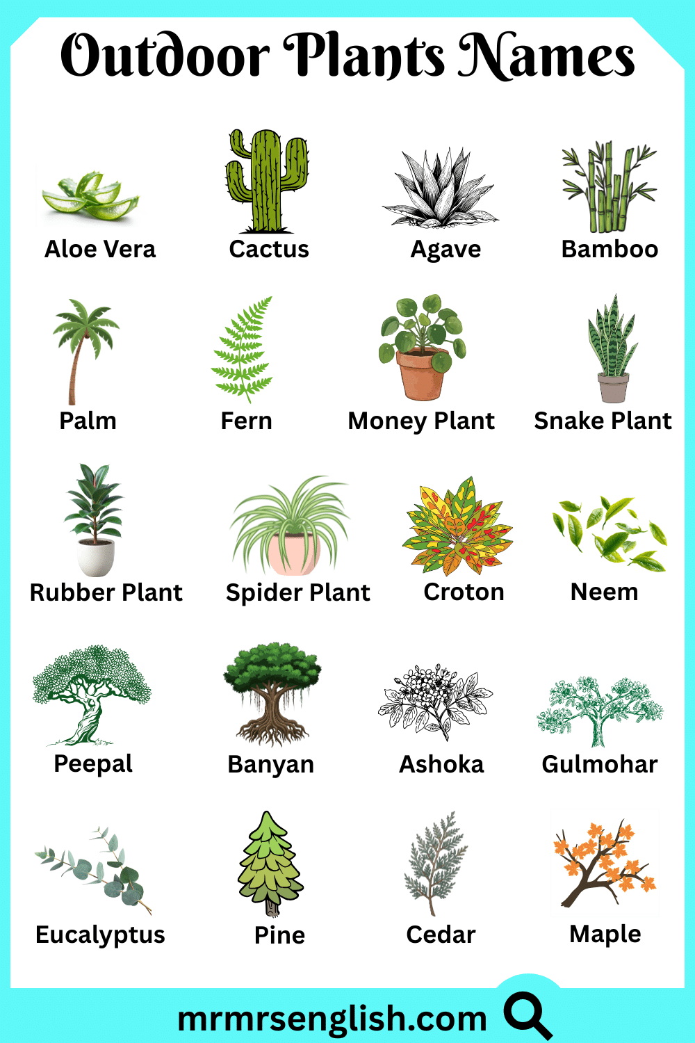 Outdoor Plants Names in English with Their Pictures is a useful and engaging topic for learners who want to explore different types of plants and improve their English vocabulary. Outdoor plants grow naturally in gardens, parks, and open spaces, adding beauty, freshness, and greenery to the environment. These plants come in many varieties, including flowering plants, shrubs, and trees, and they play an important role in improving air quality and creating a pleasant atmosphere. In this post, you will discover different outdoor plant names along with their pictures, making it easier to recognize and remember them. This guide is especially helpful for students, beginners, and nature lovers who want to learn plant names in a simple and enjoyable way.