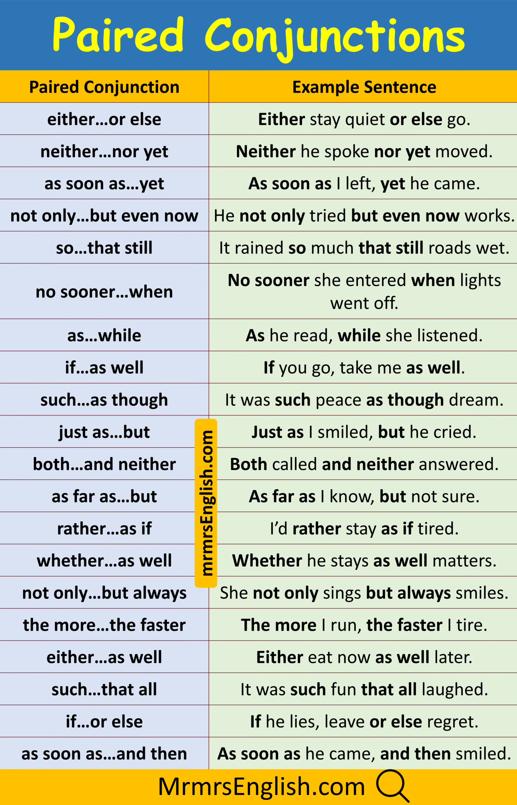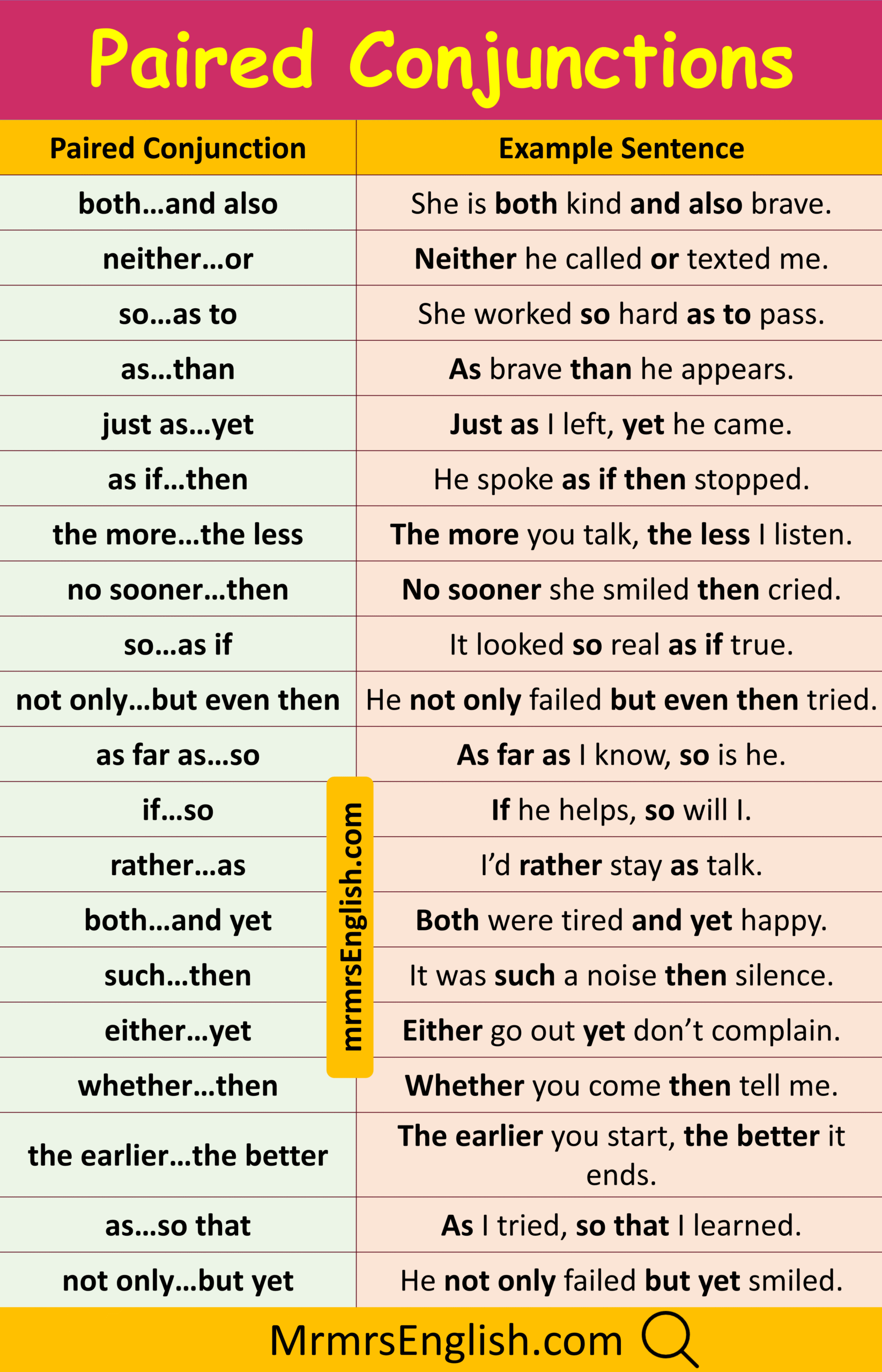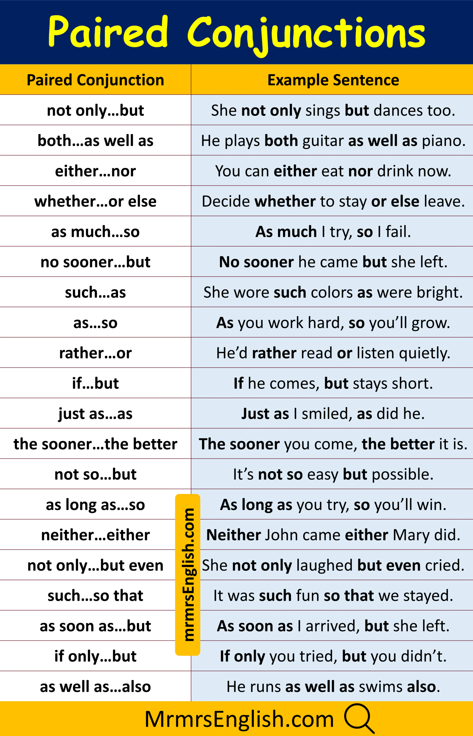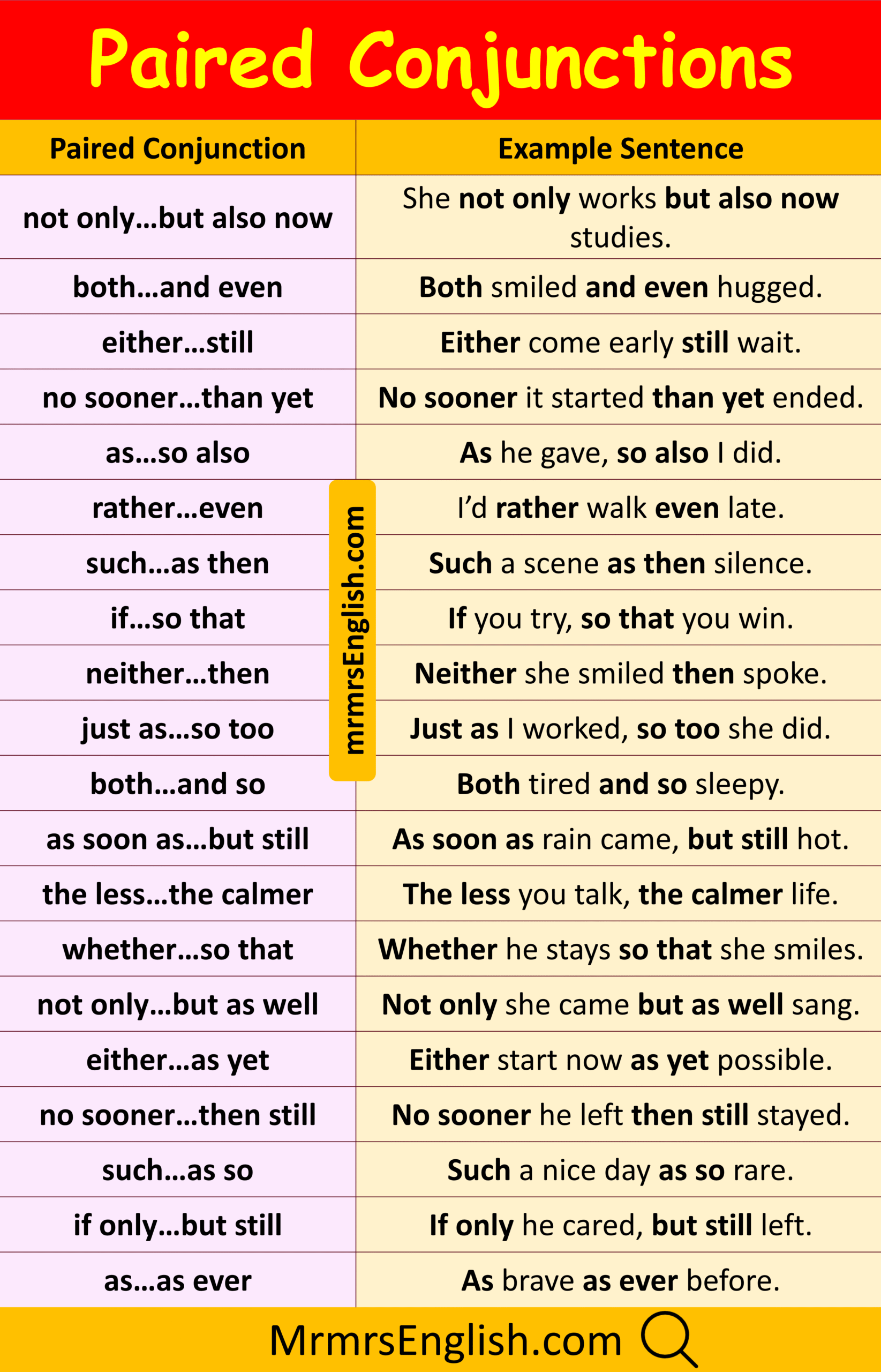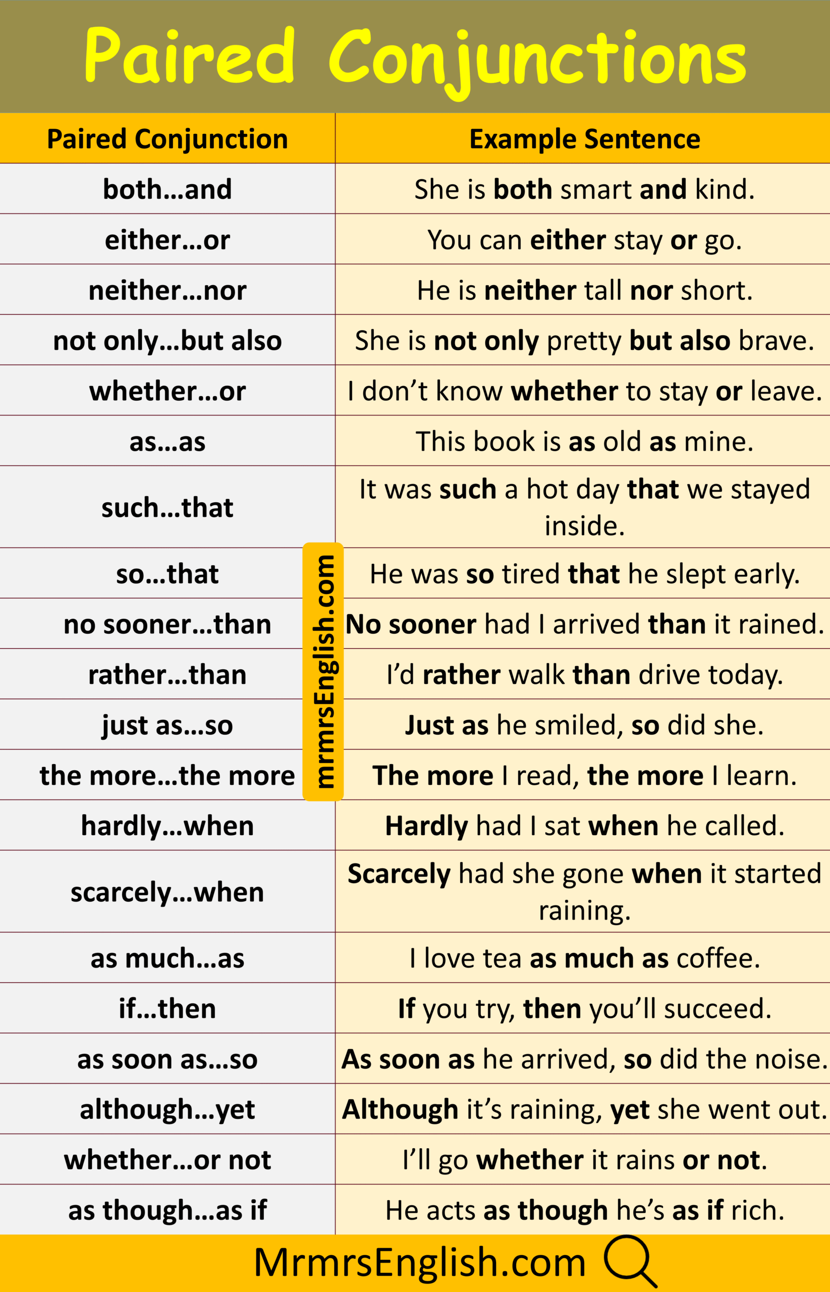 Learning paired conjunctions in English is a great way to make your sentences more balanced and meaningful. Paired conjunctions, such as either…or, neither…nor, both…and, and not only…but also, are used to join two equal ideas in a sentence. They help you express thoughts clearly and make your writing sound more natural. In this article, you will learn Paired Conjunctions Examples Sentences with pictures to help you understand and remember them easily. This guide is perfect for students, beginners, and anyone who wants to improve their English grammar and writing skills.