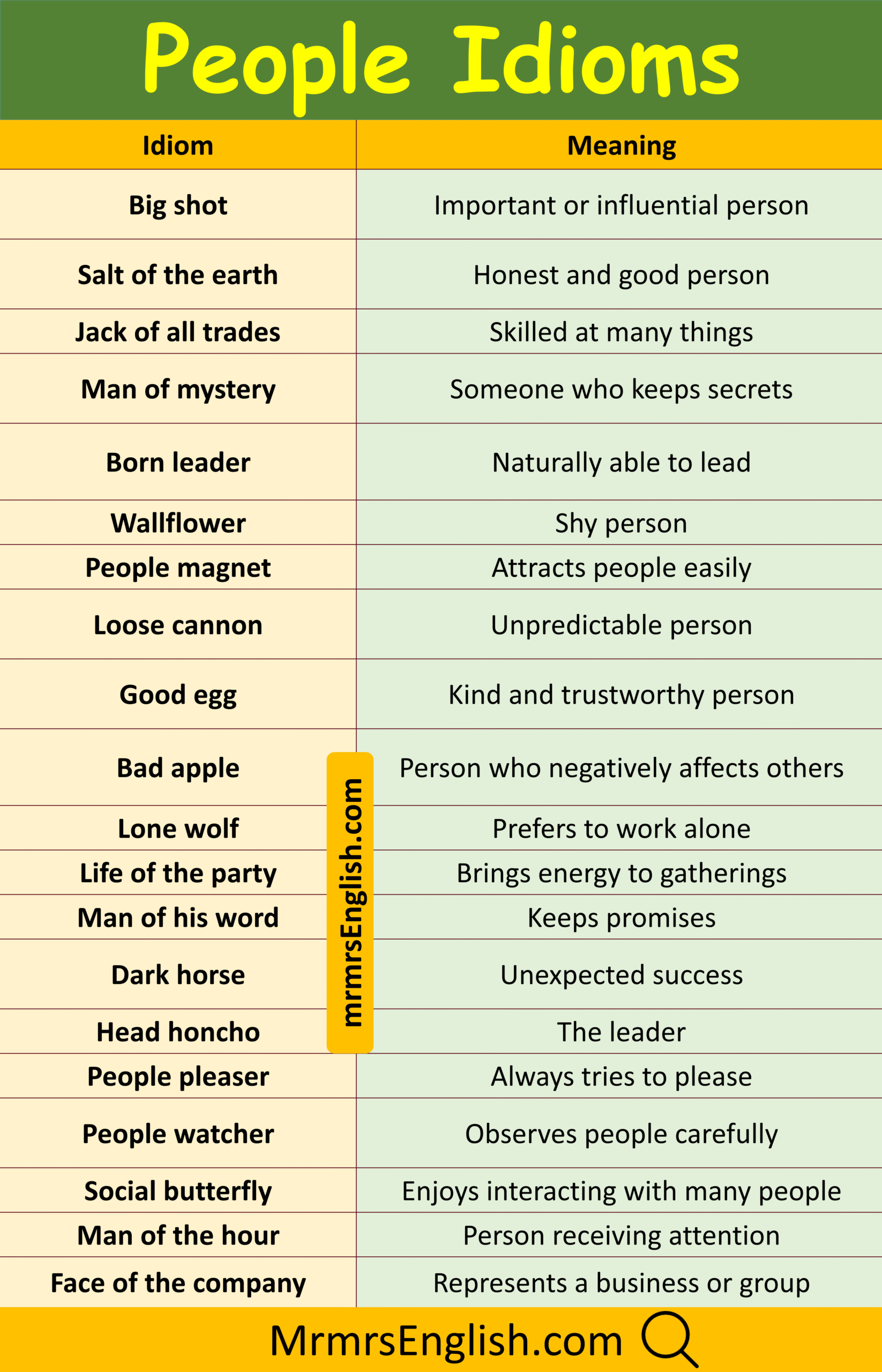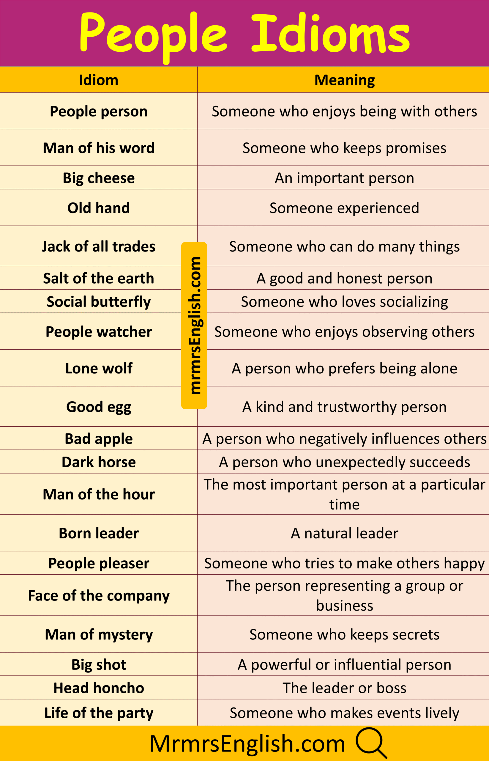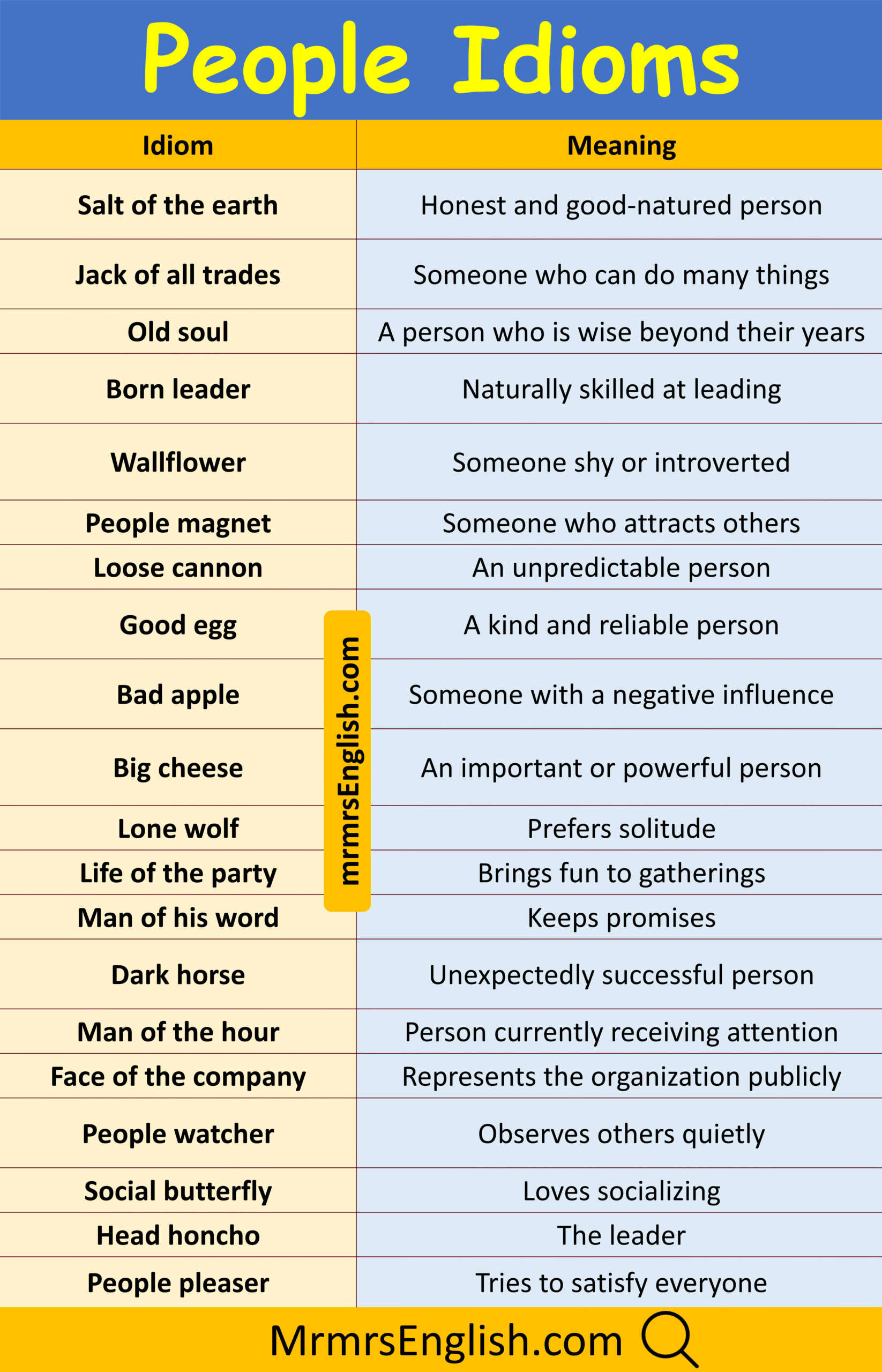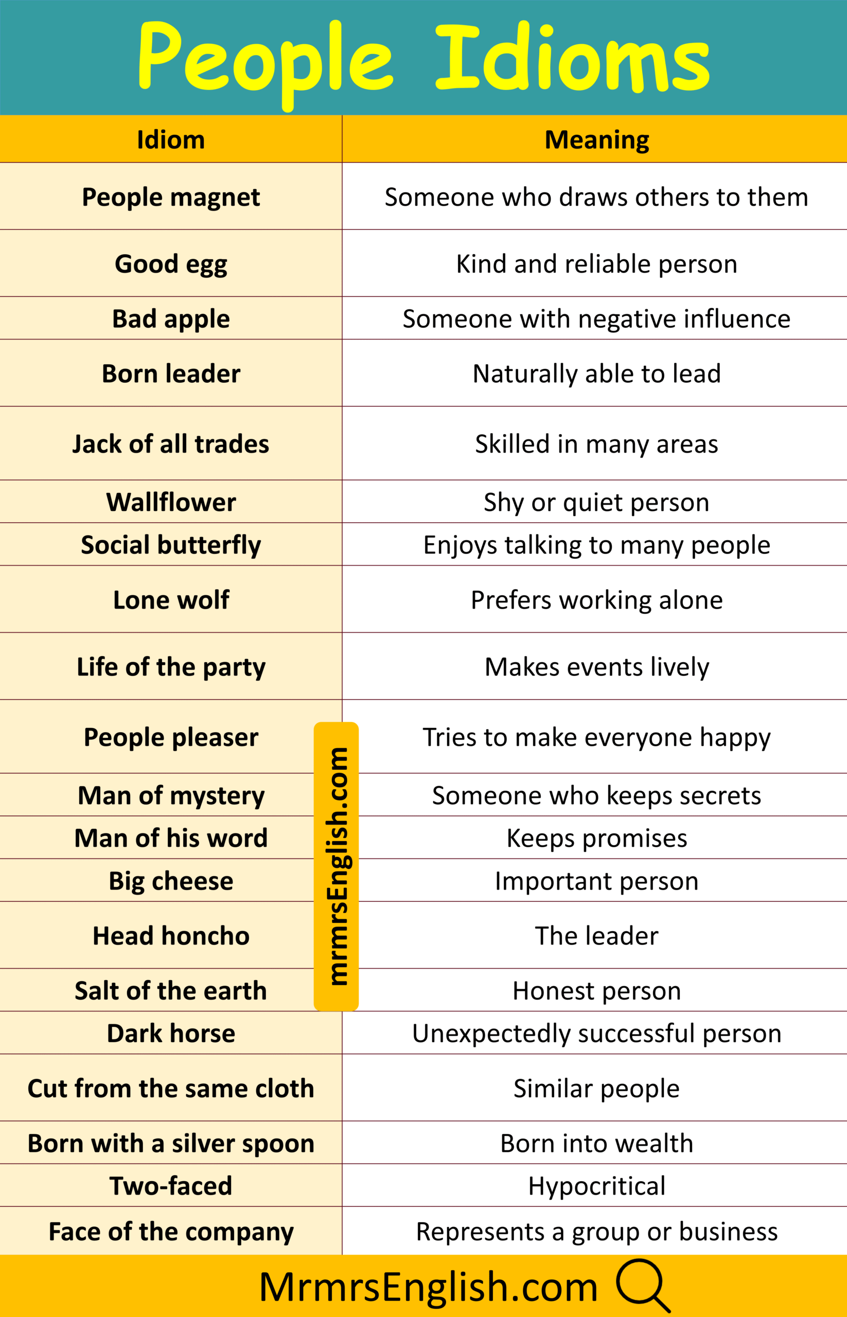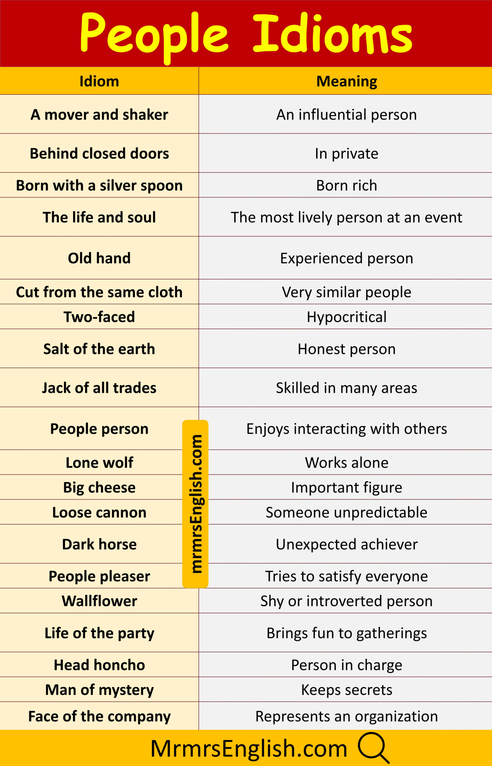 Idioms about people are commonly used in English to describe different personalities, behaviors, and human qualities in a creative way. These expressions make language more colorful and interesting, helping us talk about others in a natural and expressive manner. For example, phrases like “the life of the party” describe someone who is lively and fun, while “a people person” refers to someone who enjoys being around others. In this article, you will learn a list of people idioms in English with their meanings and pictures to help you understand and use them easily. This guide will make learning fun and will help you sound more fluent and confident in everyday conversations.