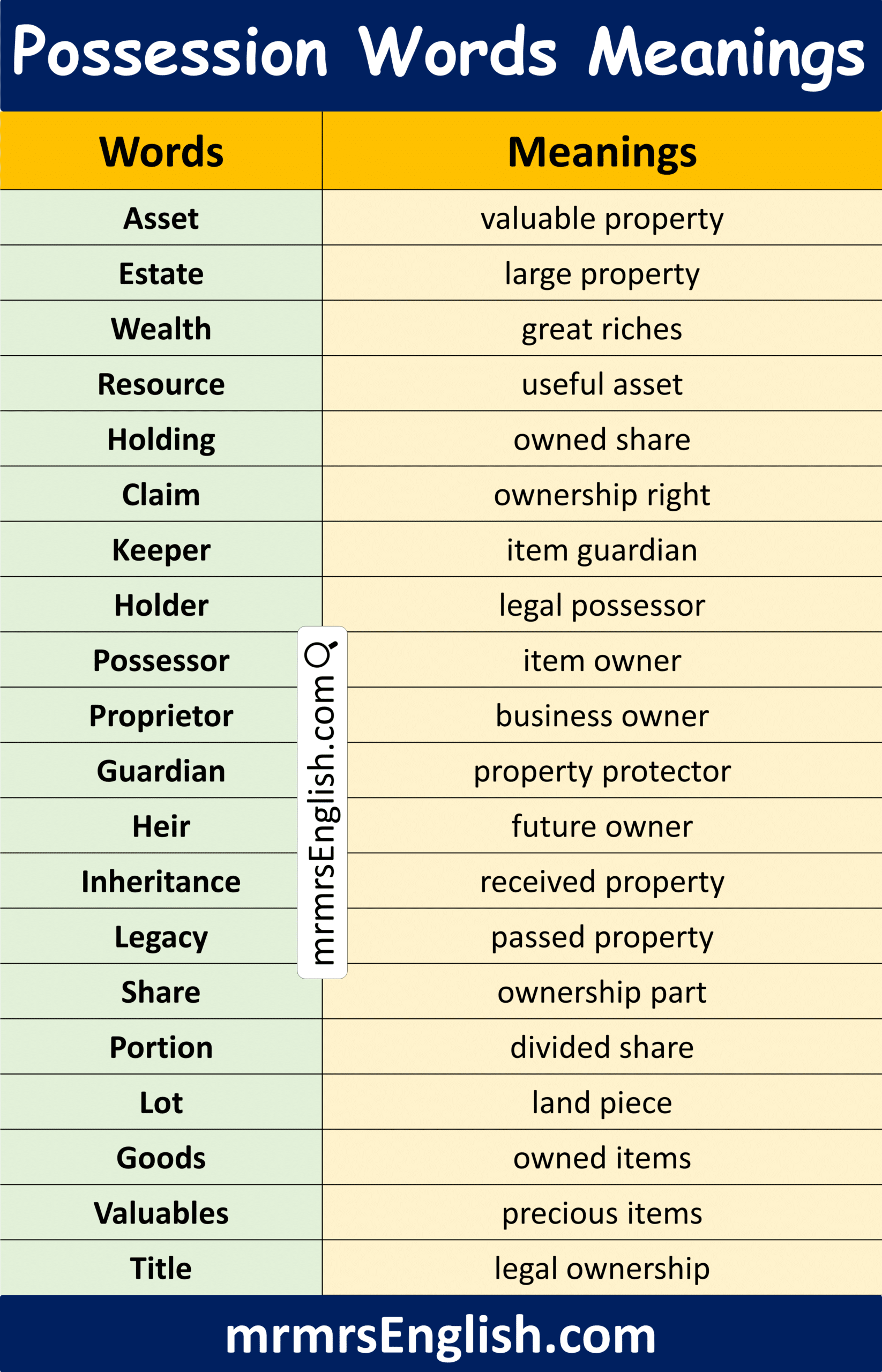100 Possession Words with Meanings in EnglishWord Meaning Asset valuable property Estate large property Wealth great riches Resource useful asset Holding owned share Claim ownership right Keeper item guardian Holder legal possessor Possessor item owner Proprietor business owner Guardian property protector Heir future owner Inheritance received property Legacy passed property Share ownership part Portion divided share Lot land piece Goods owned items Valuables precious items Title legal ownership