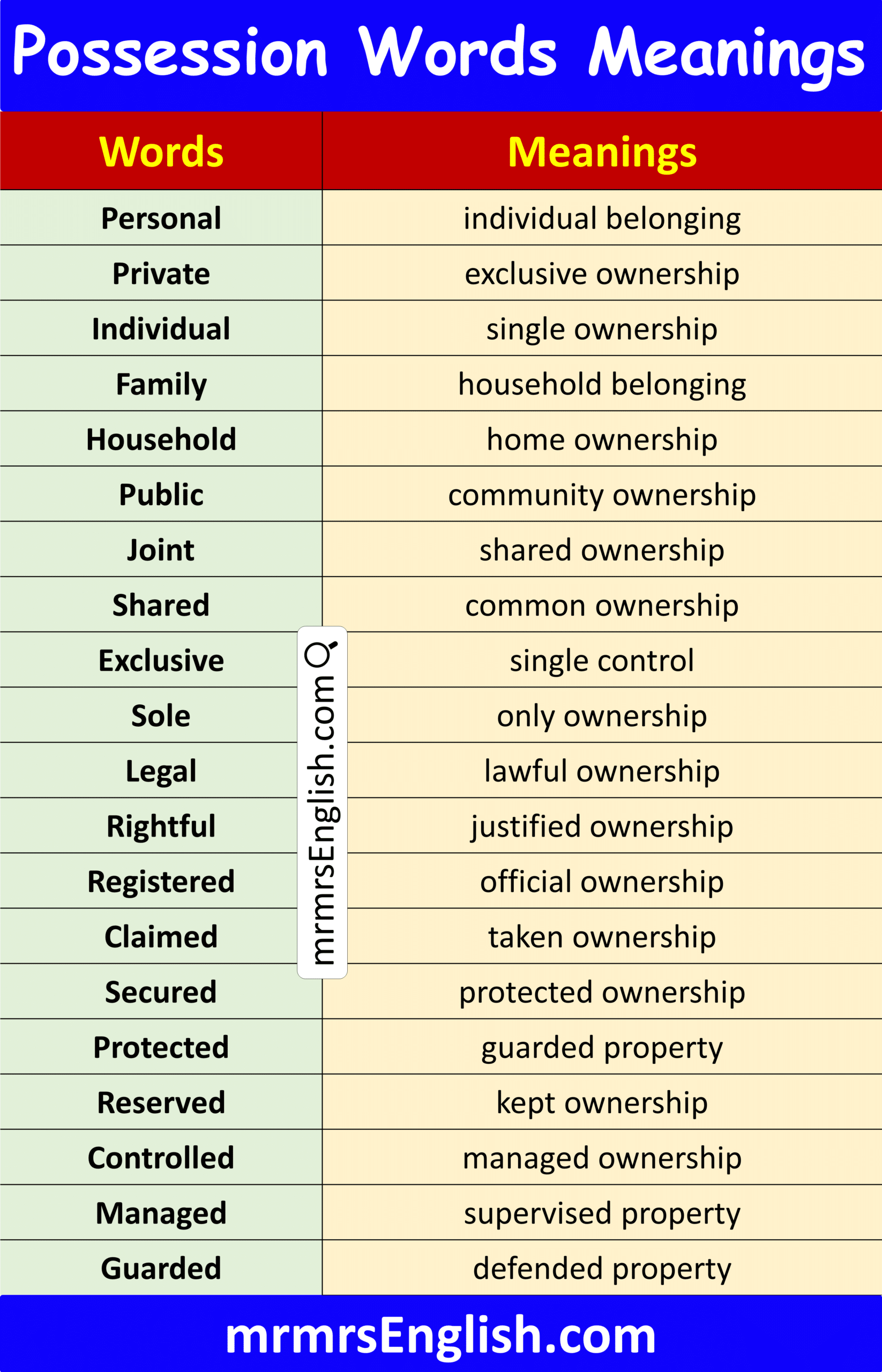 Common Possession Word with MeaningsWord Meaning Personal individual belonging Private exclusive ownership Individual single ownership Family household belonging Household home ownership Public community ownership Joint shared ownership Shared common ownership Exclusive single control Sole only ownership Legal lawful ownership Rightful justified ownership Registered official ownership Claimed taken ownership Secured protected ownership Protected guarded property Reserved kept ownership Controlled managed ownership Managed supervised property Guarded defended property