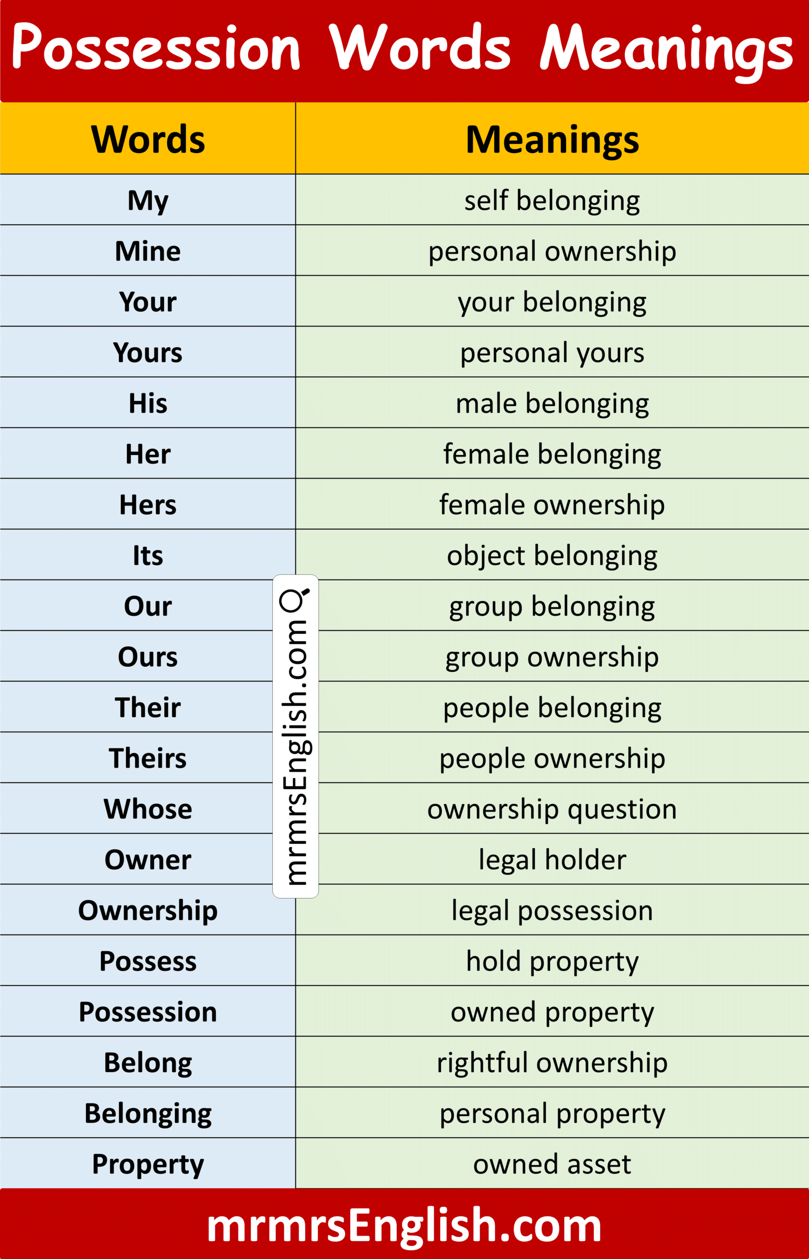 List of Possession Words in English with MeaningsWord Meaning My self belonging Mine personal ownership Your your belonging Yours personal yours His male belonging Her female belonging Hers female ownership Its object belonging Our group belonging Ours group ownership Their people belonging Theirs people ownership Whose ownership question Owner legal holder Ownership legal possession Possess hold property Possession owned property Belong rightful ownership Belonging personal property Property owned asset