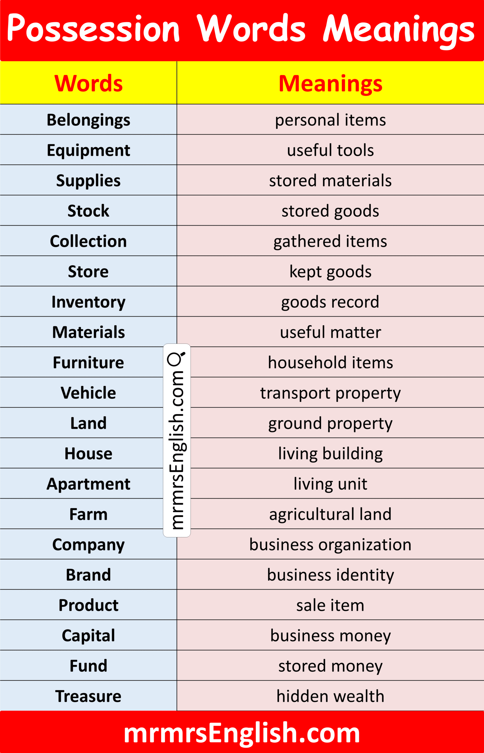Possession Words for Kids in English with ImagesWord Meaning Belongings personal items Equipment useful tools Supplies stored materials Stock stored goods Collection gathered items Store kept goods Inventory goods record Materials useful matter Furniture household items Vehicle transport property Land ground property House living building Apartment living unit Farm agricultural land Company business organization Brand business identity Product sale item Capital business money Fund stored money Treasure hidden wealth