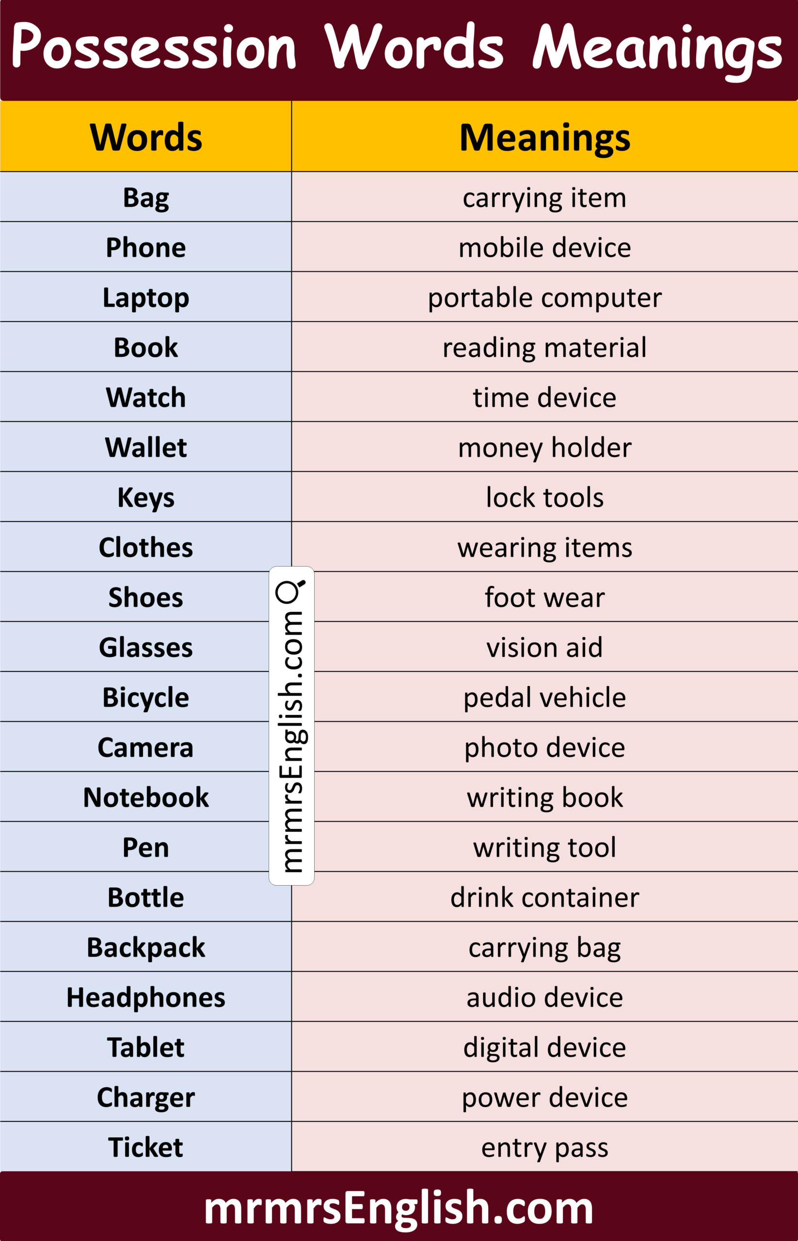 Useful Possession Word with Meanings and their ImagesWord Meaning Bag carrying item Phone mobile device Laptop portable computer Book reading material Watch time device Wallet money holder Keys lock tools Clothes wearing items Shoes foot wear Glasses vision aid Bicycle pedal vehicle Camera photo device Notebook writing book Pen writing tool Bottle drink container Backpack carrying bag Headphones audio device Tablet digital device Charger power device Ticket entry pass