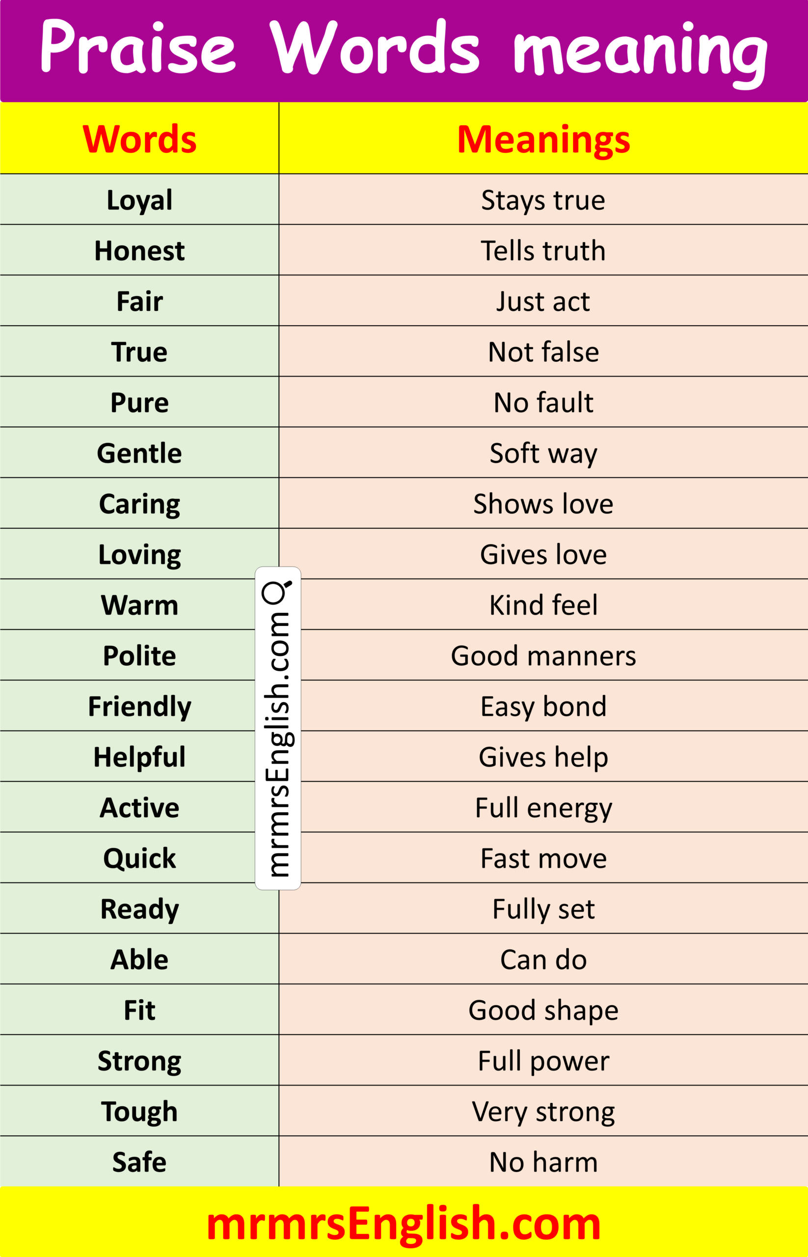 100 Praise Words in English with MeaningsWord Meaning Loyal Stays true Honest Tells truth Fair Just act True Not false Pure No fault Gentle Soft way Caring Shows love Loving Gives love Warm Kind feel Polite Good manners Friendly Easy bond Helpful Gives help Active Full energy Quick Fast move Ready Fully set Able Can do Fit Good shape Strong Full power Tough Very strong Safe No harm