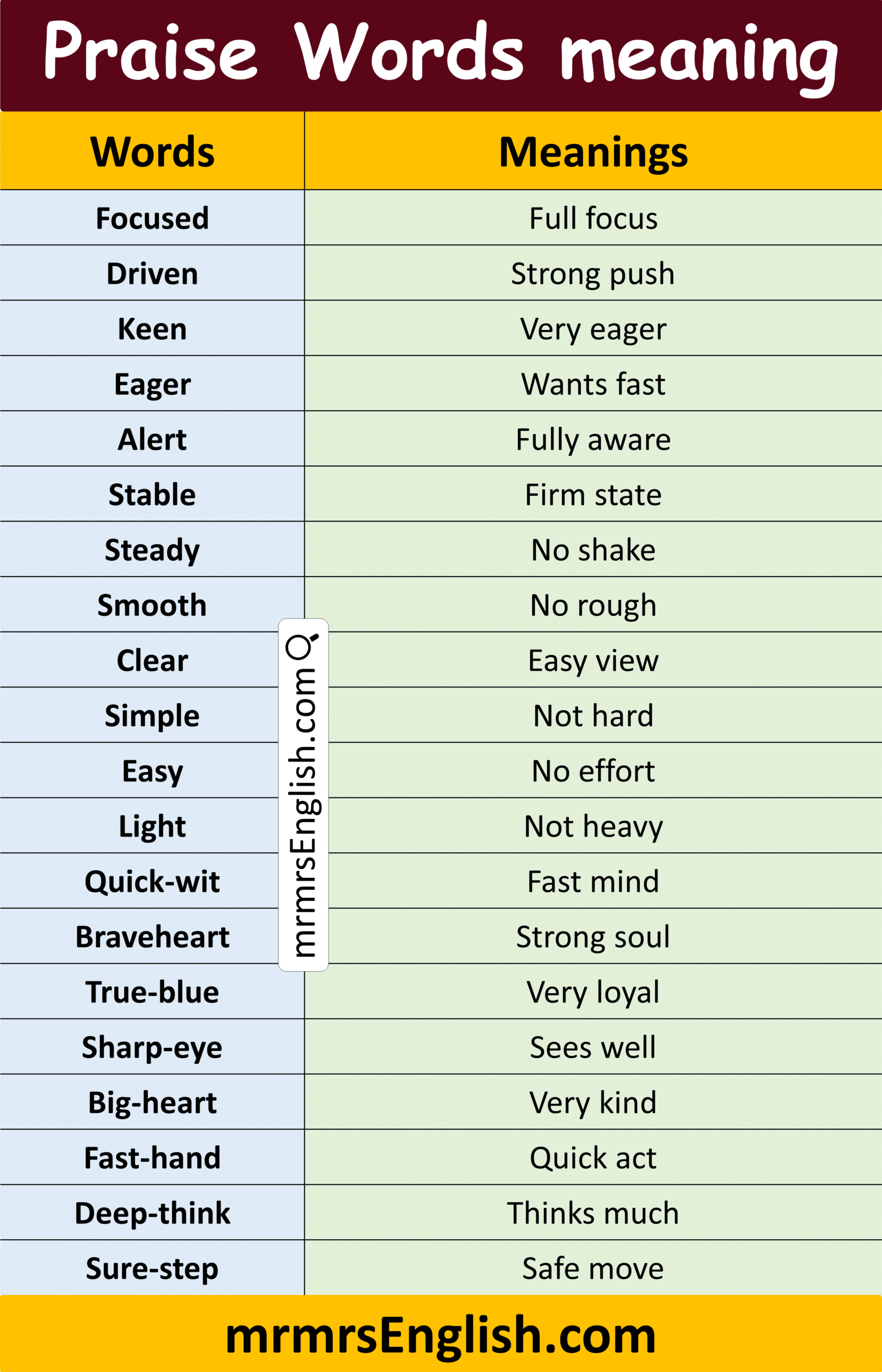 Common Praise Words with Meaning and their PicturesWord Meaning Focused Full focus Driven Strong push Keen Very eager Eager Wants fast Alert Fully aware Stable Firm state Steady No shake Smooth No rough Clear Easy view Simple Not hard Easy No effort Light Not heavy Quick-wit Fast mind Braveheart Strong soul True-blue Very loyal Sharp-eye Sees well Big-heart Very kind Fast-hand Quick act Deep-think Thinks much Sure-step Safe move