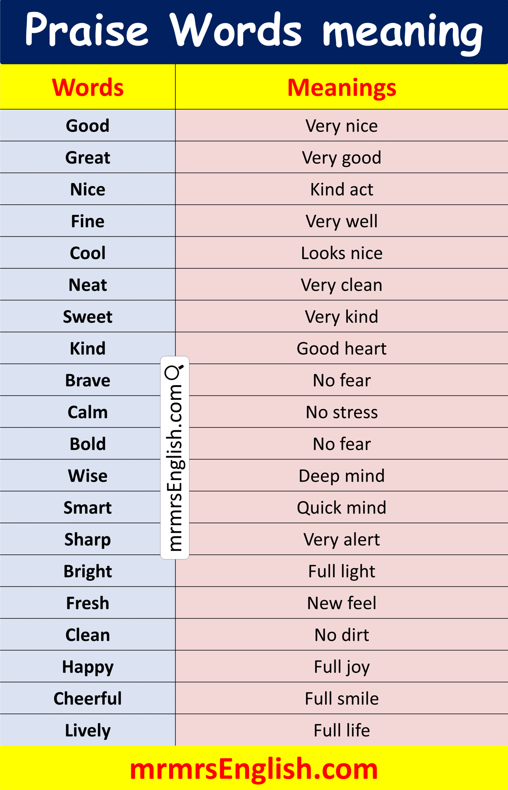 List of Praise Words with Meanings in EnglishWord Meaning Good Very nice Great Very good Nice Kind act Fine Very well Cool Looks nice Neat Very clean Sweet Very kind Kind Good heart Brave No fear Calm No stress Bold No fear Wise Deep mind Smart Quick mind Sharp Very alert Bright Full light Fresh New feel Clean No dirt Happy Full joy Cheerful Full smile Lively Full life