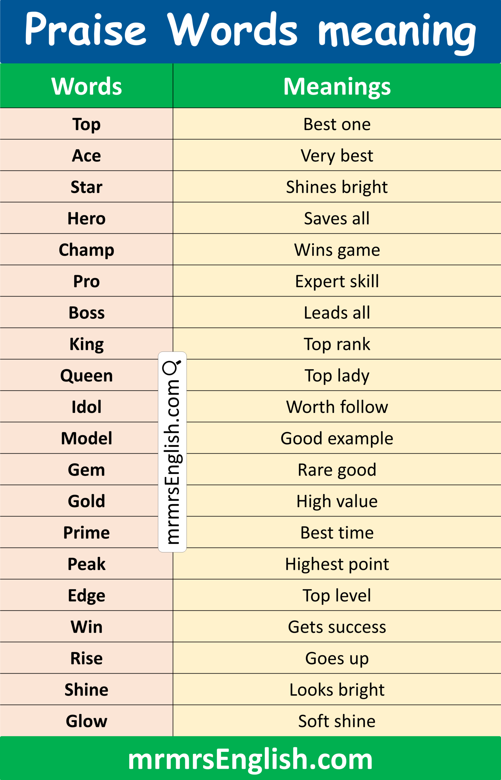Useful Word in English with PicturesWord Meaning Top Best one Ace Very best Star Shines bright Hero Saves all Champ Wins game Pro Expert skill Boss Leads all King Top rank Queen Top lady Idol Worth follow Model Good example Gem Rare good Gold High value Prime Best time Peak Highest point Edge Top level Win Gets success Rise Goes up Shine Looks bright Glow Soft shine