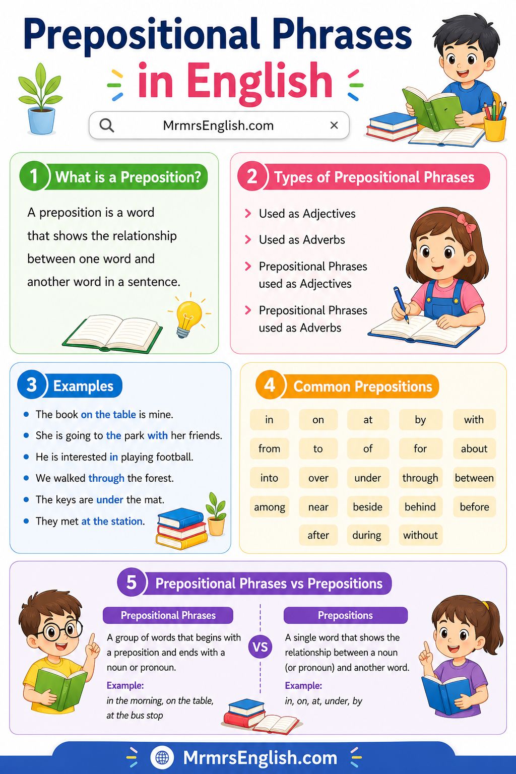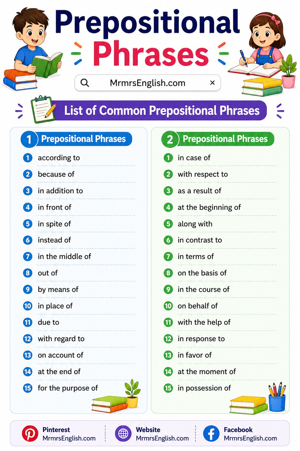 A prepositional phrase is a group of words that begins with a preposition and usually ends with a noun, pronoun, or noun phrase called the object of the preposition.