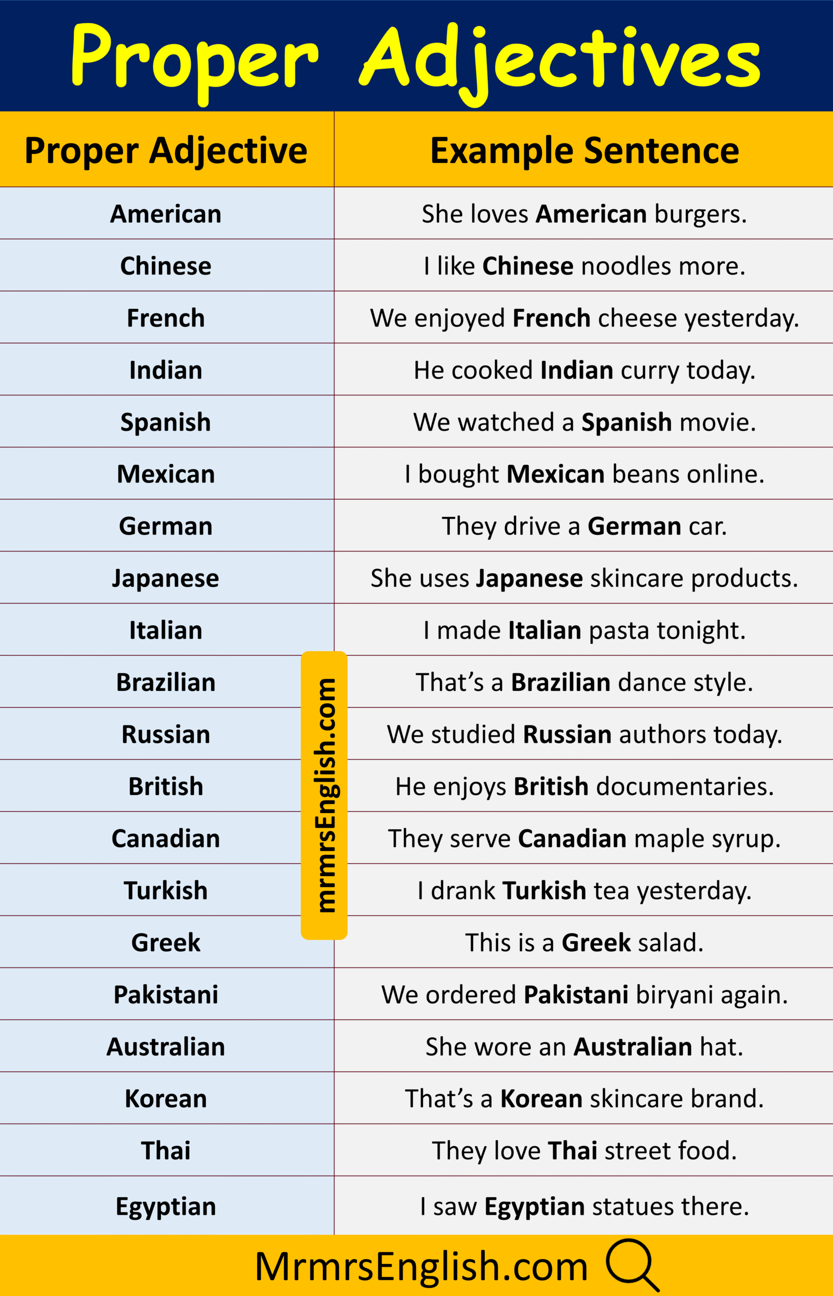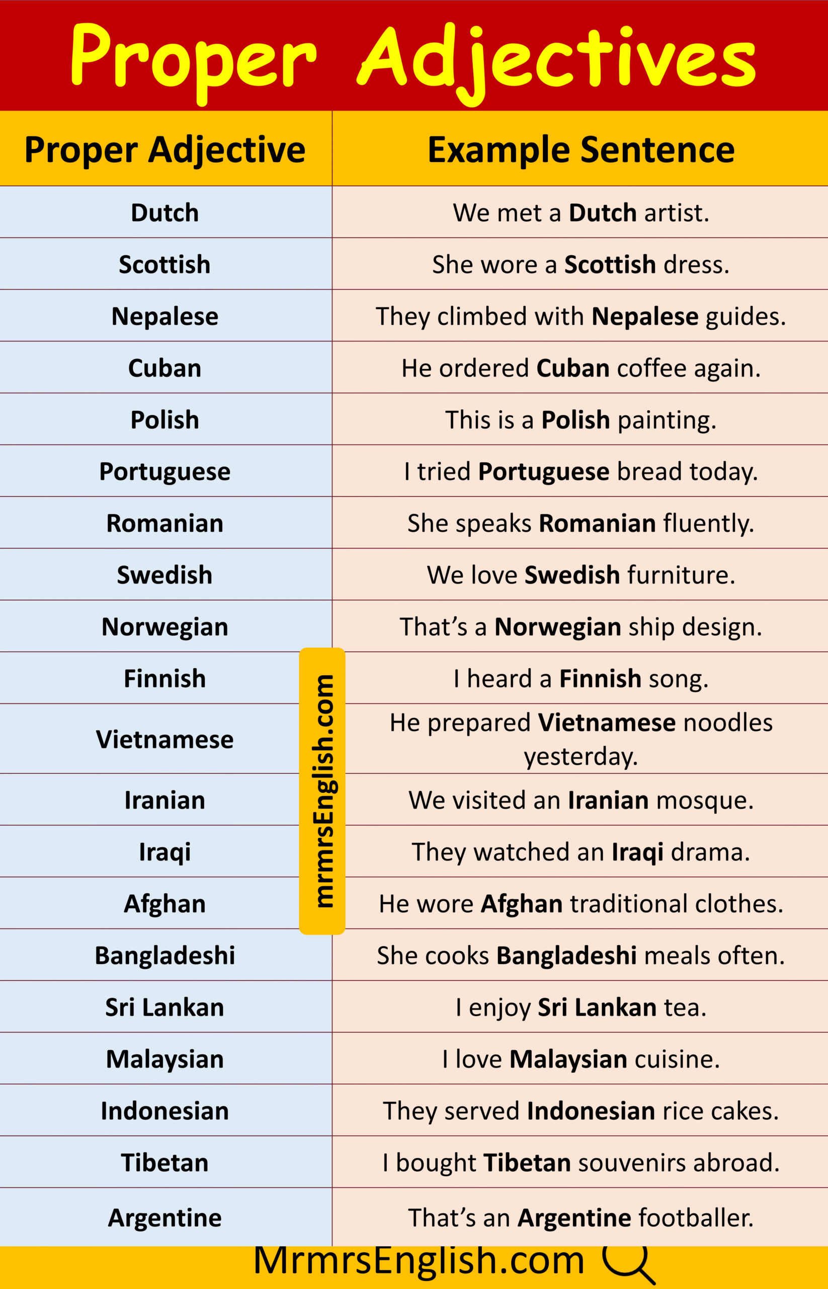 Learning English becomes easier when we understand how words work. One useful type of word is the proper adjective. These adjectives come from proper nouns like countries, names, or places, and they always begin with a capital letter. For example, when we say “Italian pizza” or “Chinese tea”, the words Italian and Chinese are proper adjectives because they describe something by linking it to a place. In this article, you’ll learn 100 Proper Adjectives Examples Sentences with pictures to help you learn how proper adjectives are used in real life. Each sentence is simple, clear, and made to help learners like you build stronger English skills step by step.