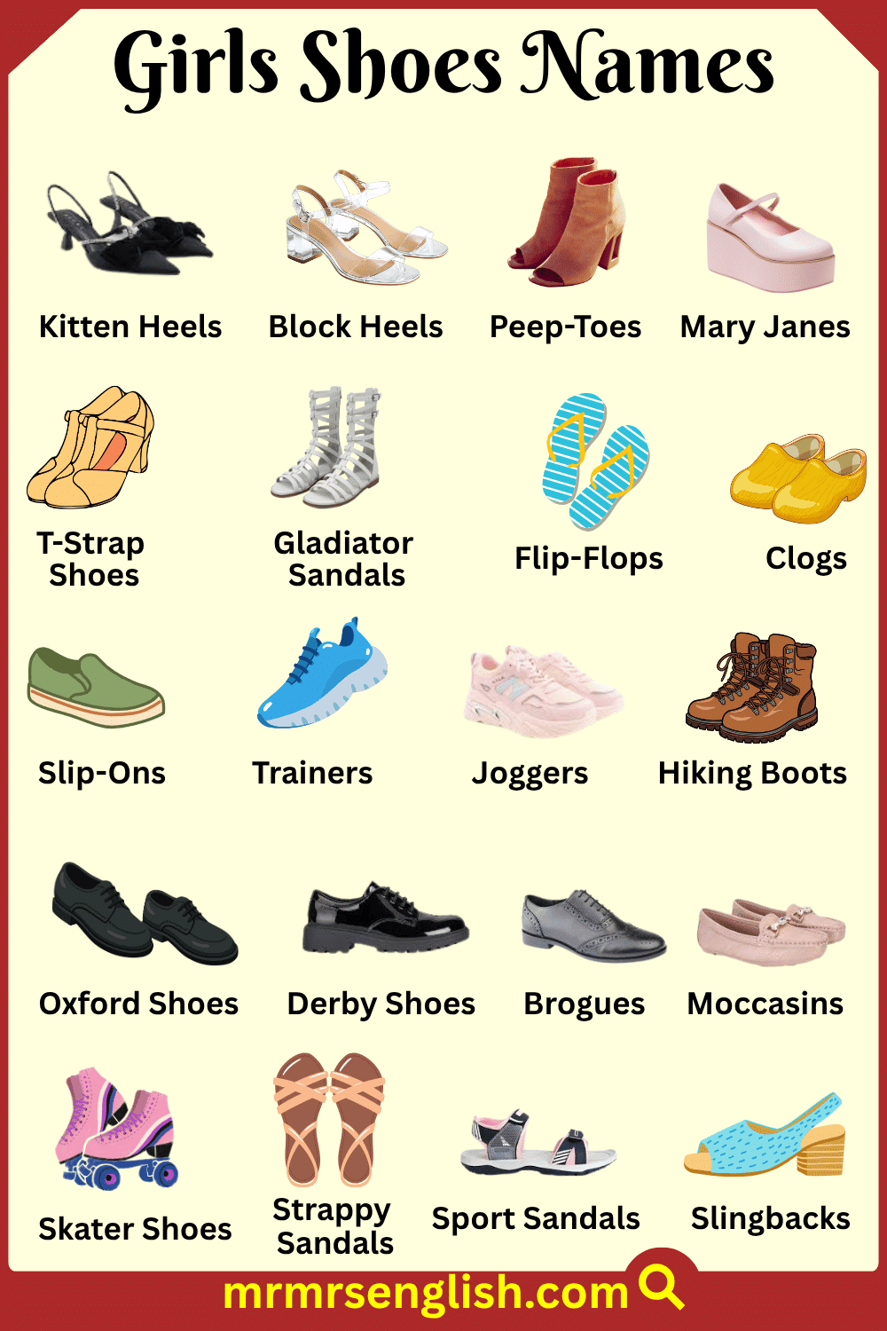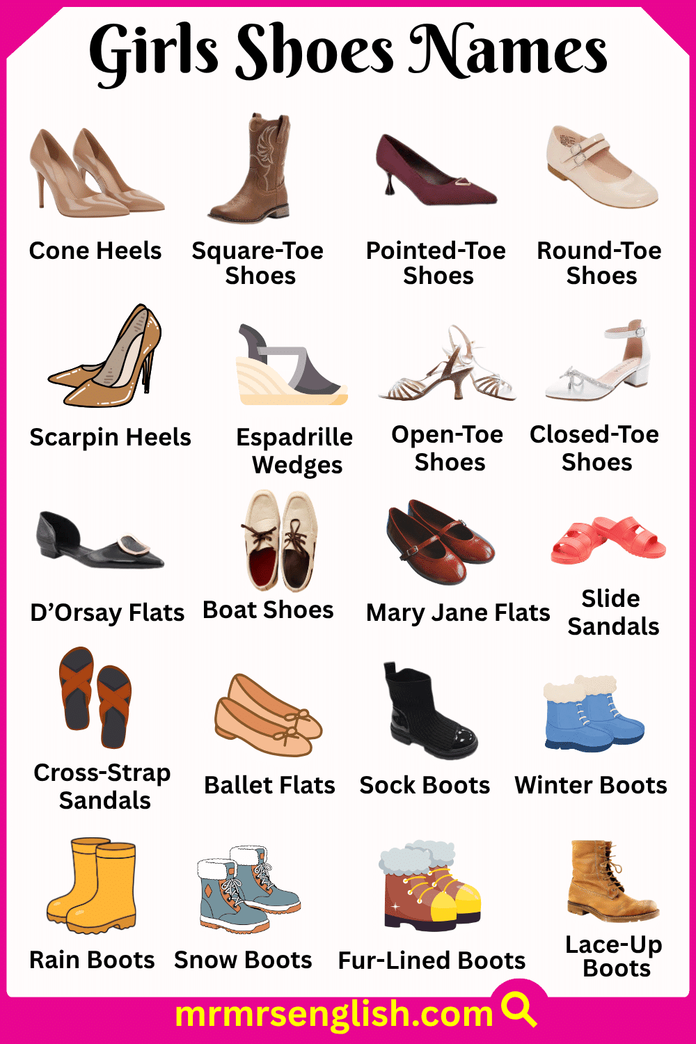 Shoes are an important part of every girl’s life, not only for comfort and protection but also as a part of style and fashion. From school shoes to party shoes, there are many types that girls wear for different occasions. Each type of shoe has its own name and design, which makes it fun and useful to learn them in English. Knowing these names helps students and learners improve their vocabulary while also making shopping and daily conversations easier. In this article, we will learn the shoes names for girls in English with their pictures to make learning simple, clear, and enjoyable.
