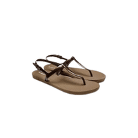 Sandals with a vertical strap that connects to a horizontal one, forming a “T” shape on the foot.