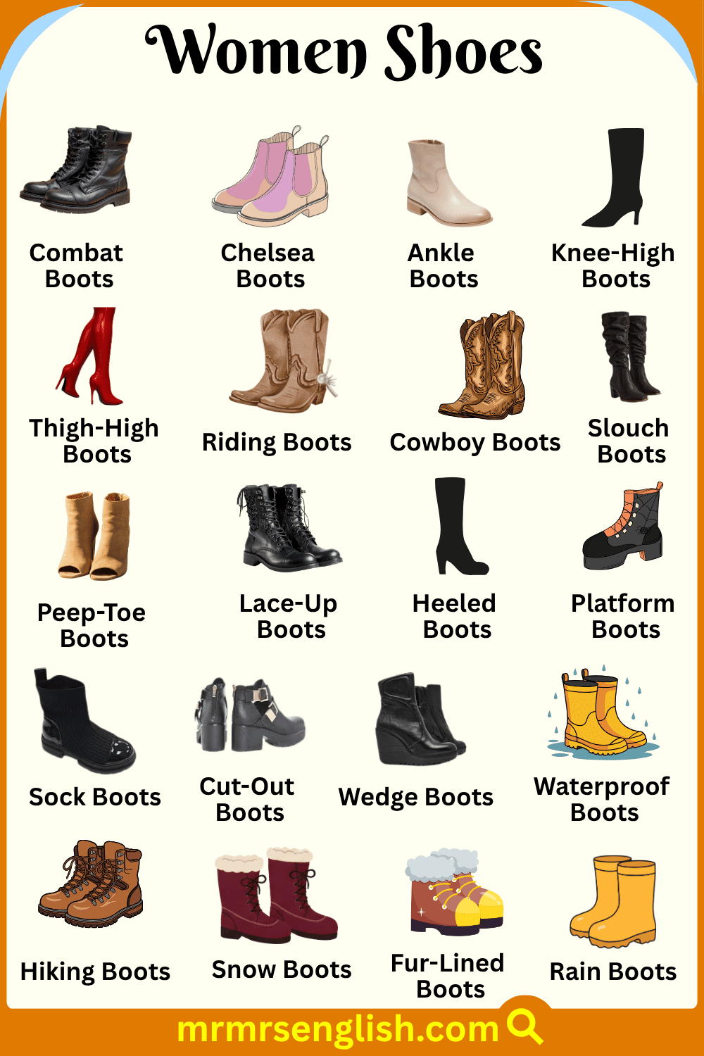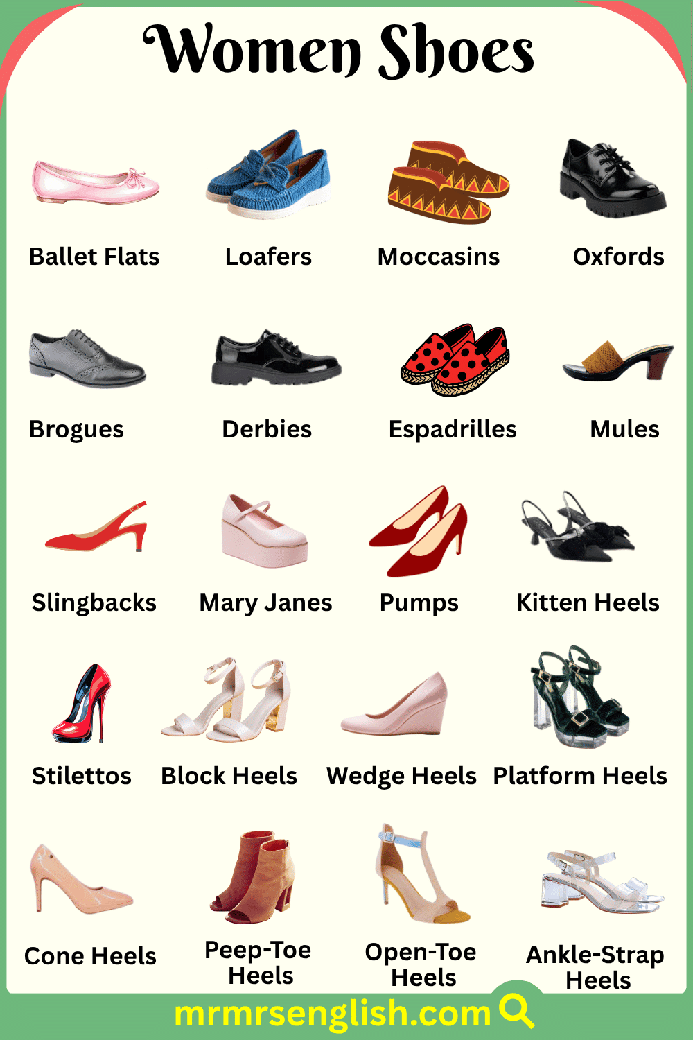 Shoes are more than just a necessity for women; they are also a part of fashion, style, and comfort. From casual wear to formal events, women use different types of shoes for different occasions. Each type of shoe has its own name, design, and purpose, which makes it important to know the right terms in English. Learning these names not only improves vocabulary but also helps in shopping, fashion discussions, and daily conversations. In this article, we will learn the types of shoes names for women in English with their pictures to make learning simple, clear, and enjoyable.