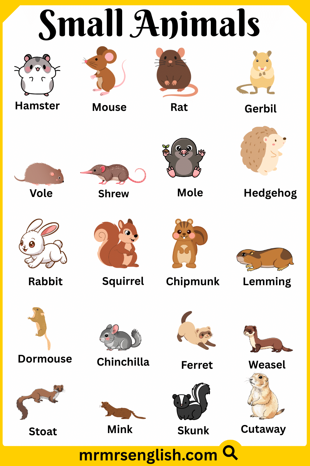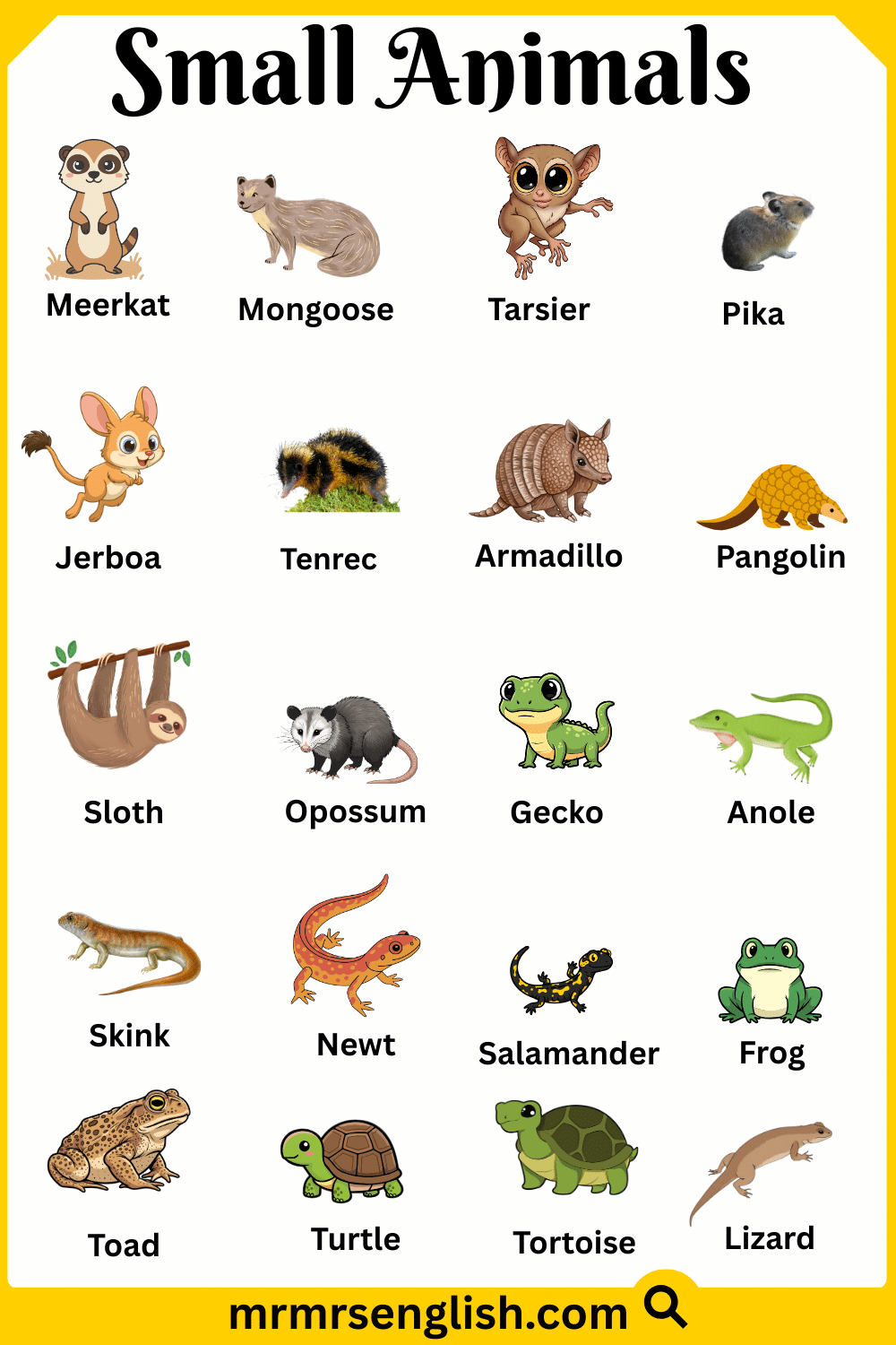 Small Animals Names in English with Their Pictures is a fun and helpful topic for learners of all ages. Small animals are easy to recognize, cute to look at, and interesting to learn about. They can be pets, farm animals, or animals found in nature around us. In this blog post, you will learn the names of common small animals in English along with their pictures, which makes learning simple and enjoyable. Pictures help readers understand faster and remember the names better, especially beginners and young learners. This guide is perfect for improving vocabulary in a clear, friendly, and engaging way.