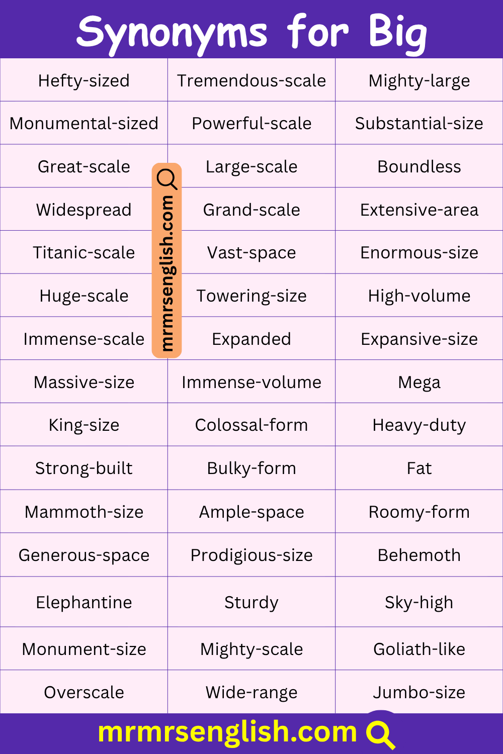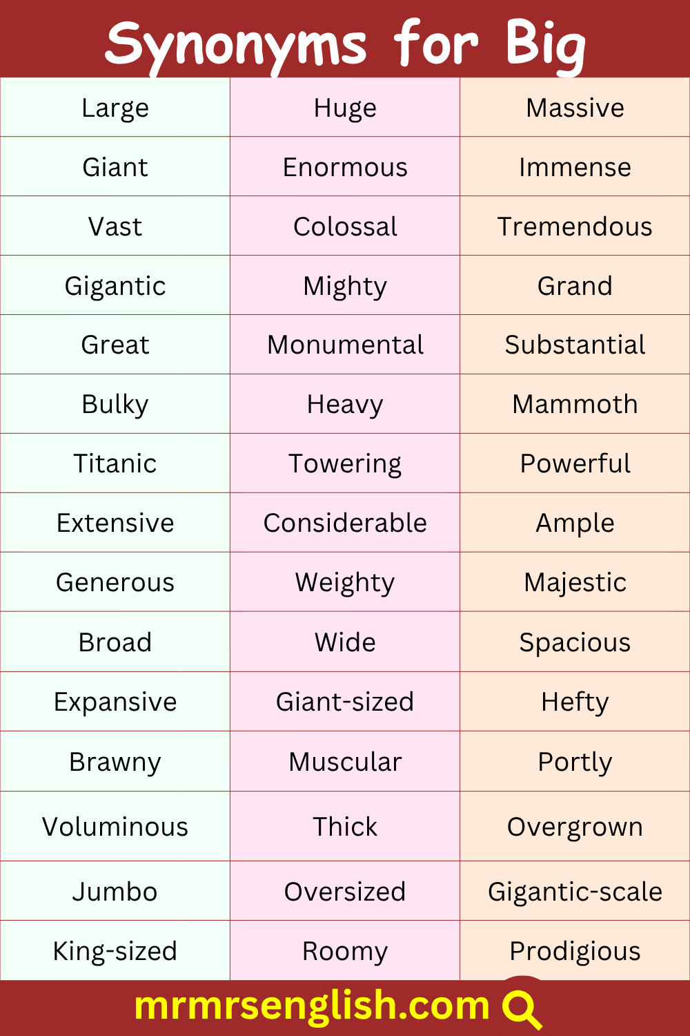 Learning the word big helps you describe things that are large in size, amount, or importance. It’s a common word used in daily English to express quantity, strength, or significance. Expanding your vocabulary with similar words makes your communication more precise and expressive. This article includes 90 synonyms for big in English with pictures to make learning easy, visual, and fun for everyone.