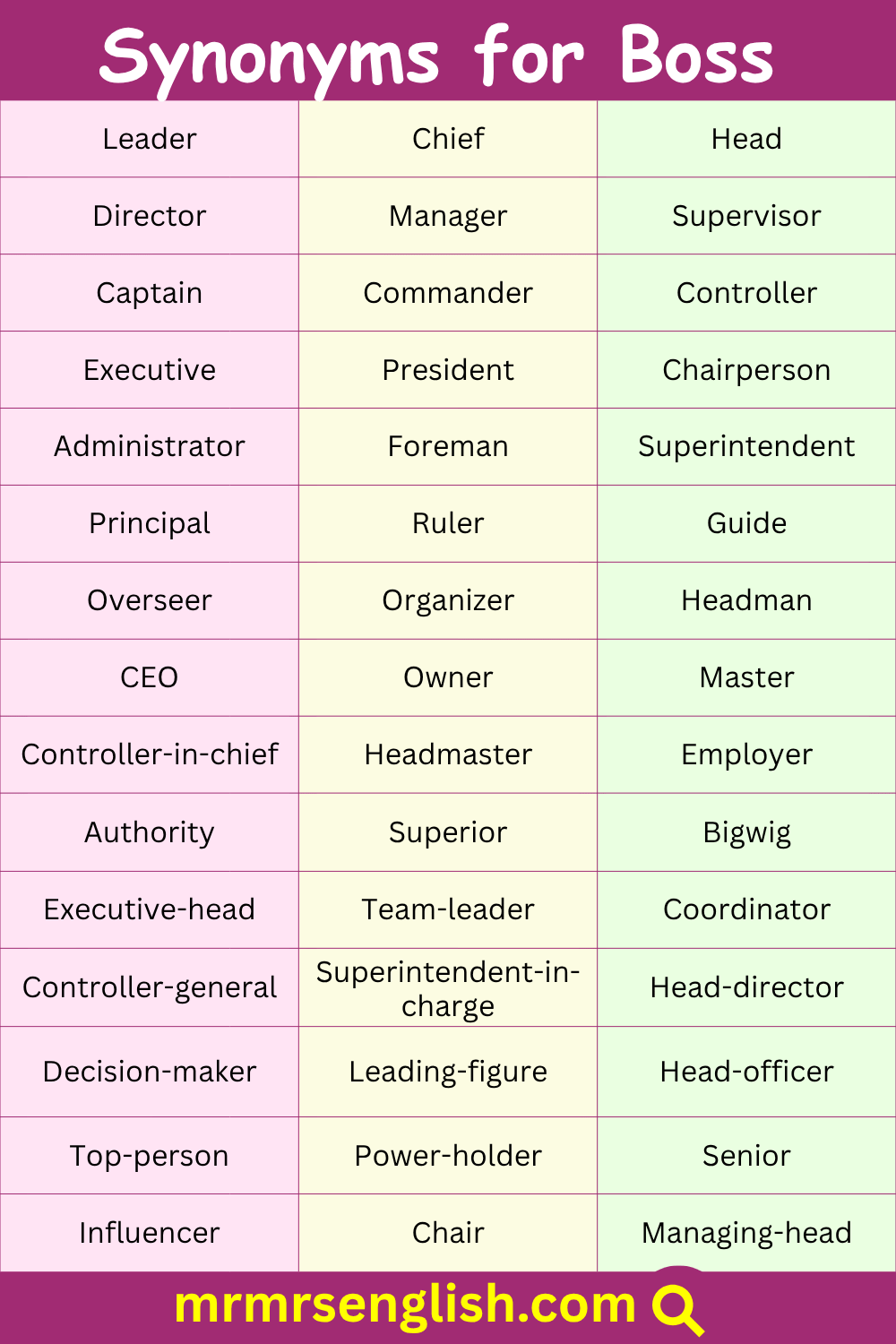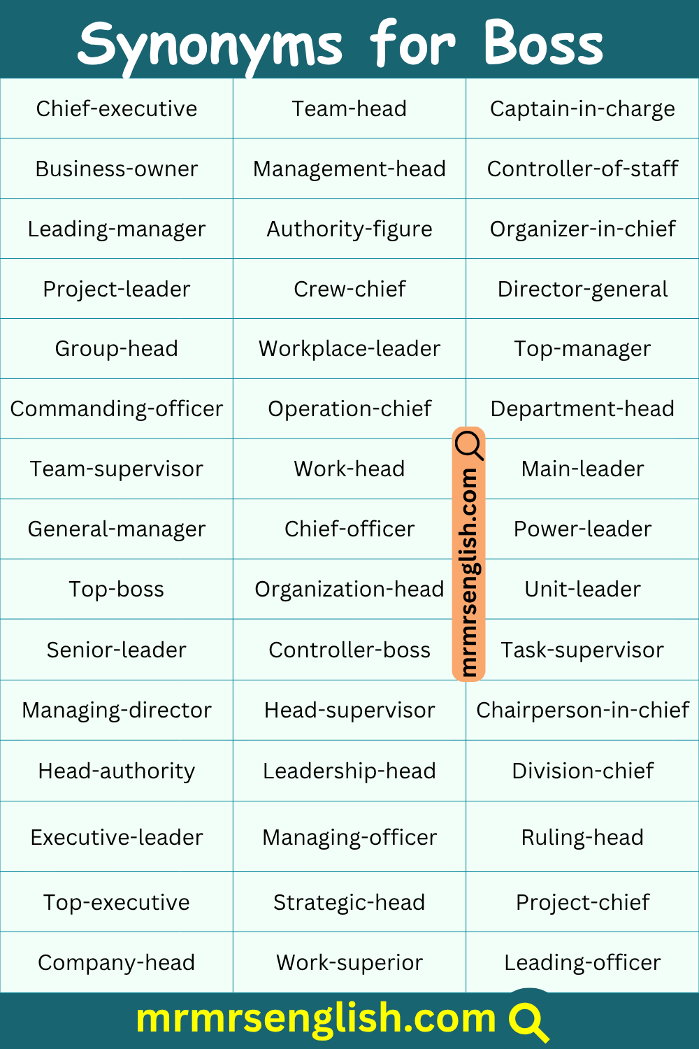 The word boss is commonly used to describe a person who leads, manages, or has authority over others, but English offers many other words with similar meanings. These synonyms can be formal or informal, modern or traditional, and each one fits a different situation or tone. Learning these alternatives helps you speak and write more clearly, professionally, and confidently. In this article, you will learn 100 synonyms for boss with simple explanations and helpful pictures to make each word easier to understand and remember. This guide is written in easy, natural language for students, professionals, and everyday learners.