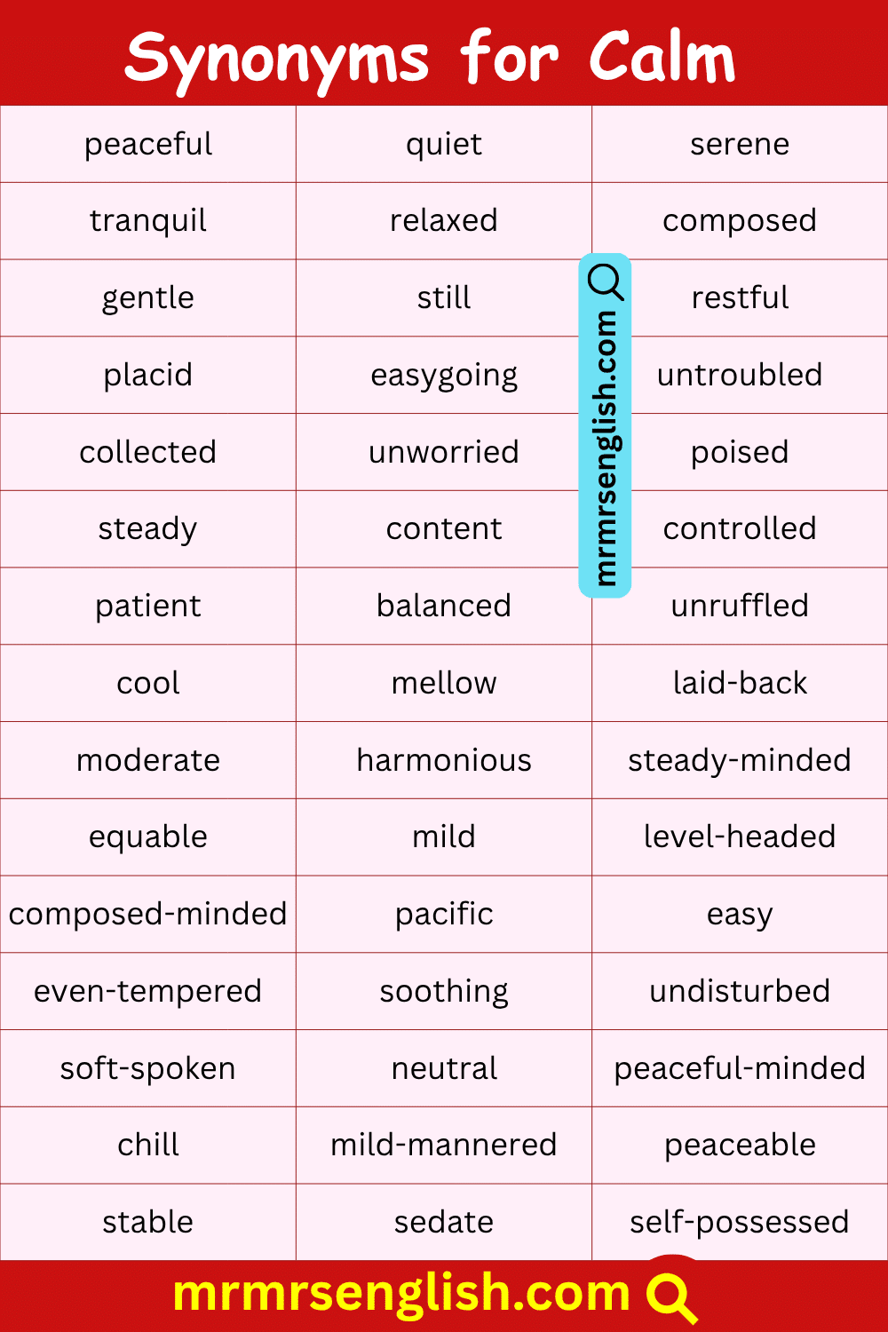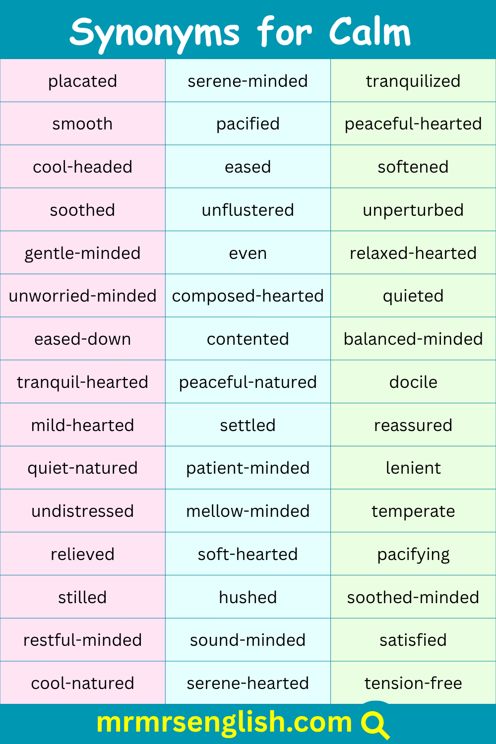 “Calm” means being peaceful, relaxed, and free from strong emotions or noise. It describes a state of quietness and stability in both people and surroundings. It is often used to show emotional balance and tranquility in speech and writing.