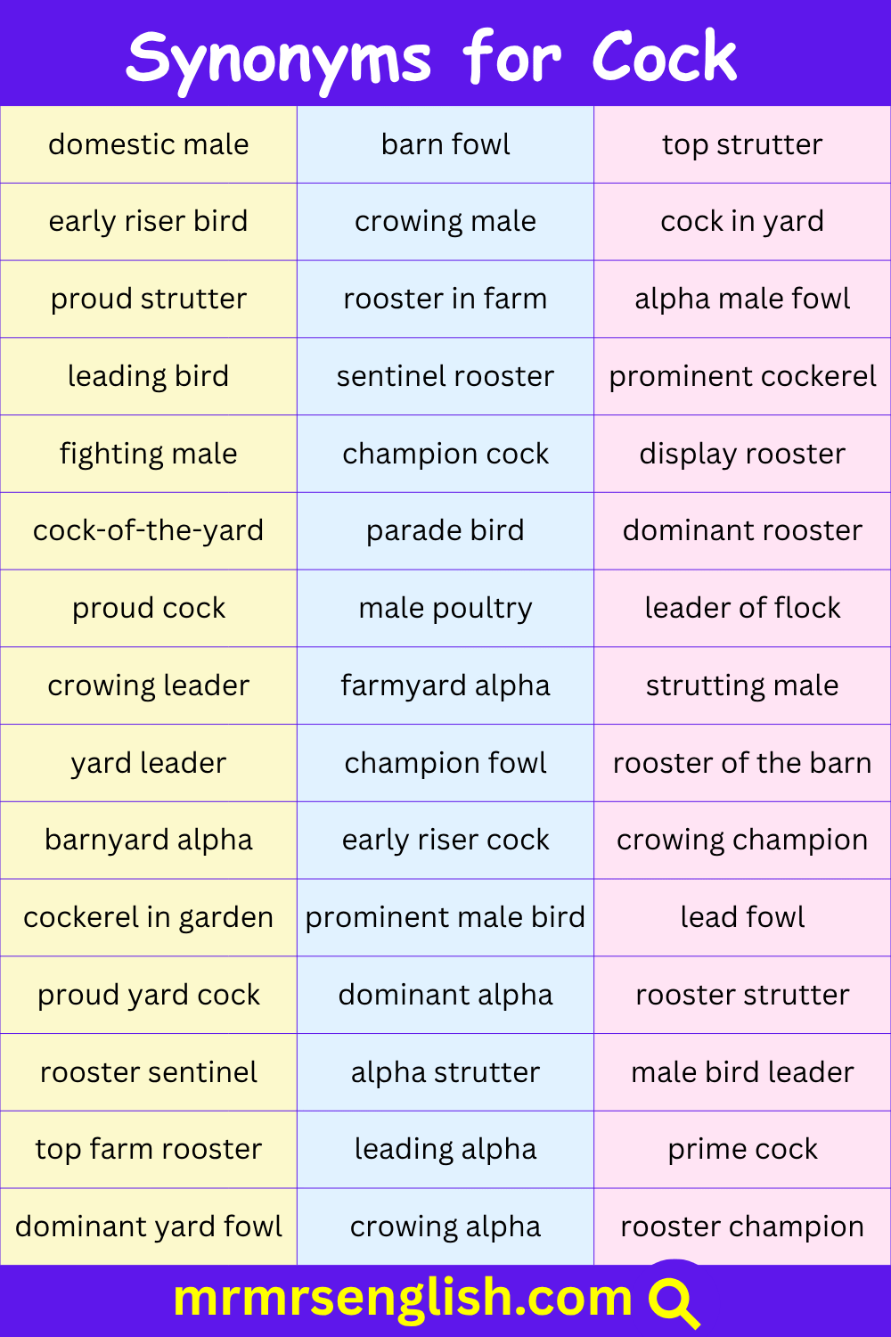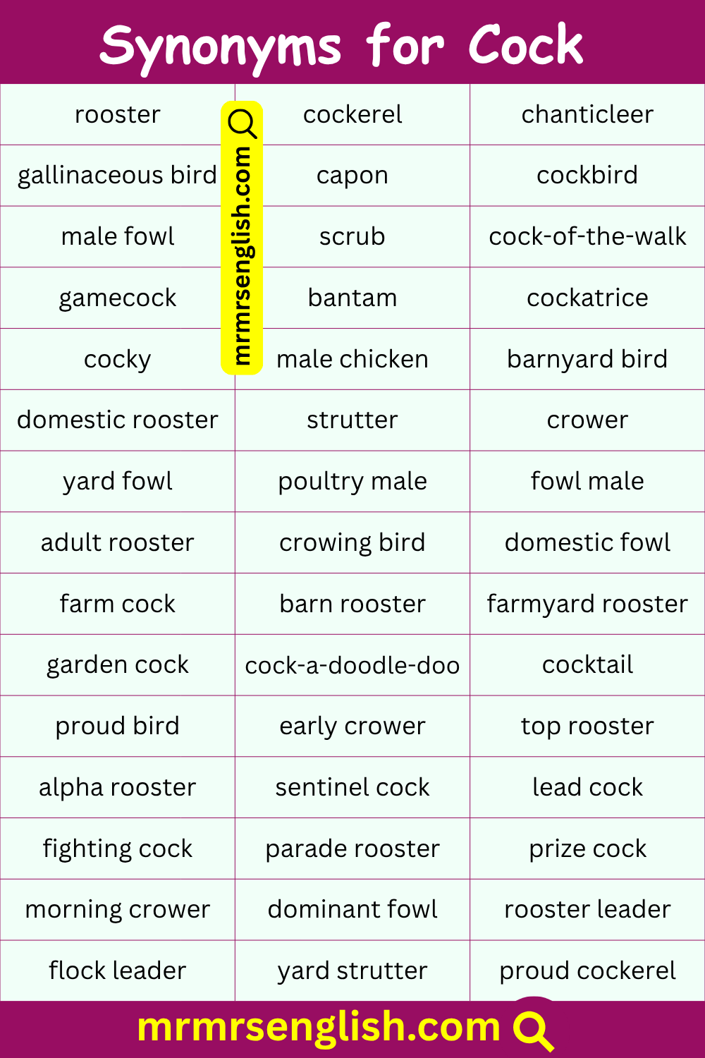 “Cock” usually refers to a male chicken, known for its crowing and role in breeding. It can also describe certain mechanical devices, or be used in idioms. The meaning depends on context, but it often represents alertness, pride, or readiness.