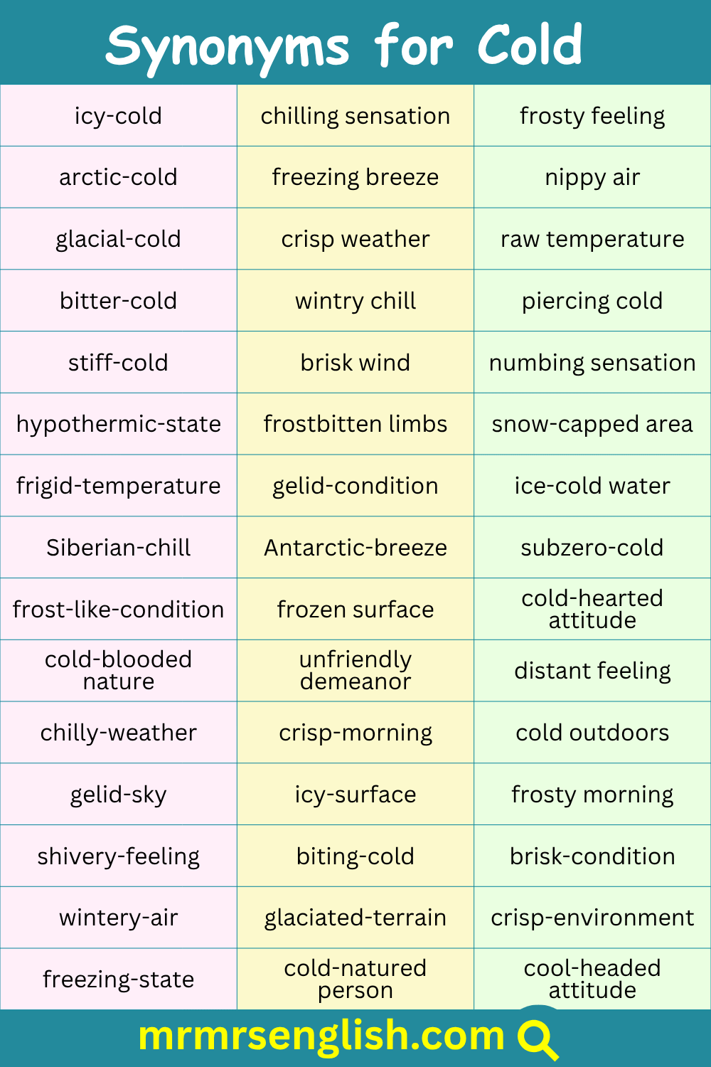Cold is a common feeling and experience that we often describe in many different ways, whether we are talking about the weather, a person’s behavior, or the temperature of food and objects. Having a rich collection of words for “cold” helps us express ourselves more clearly and naturally in everyday English. In this article, you will learn 100 Synonyms for Cold in English with their Pictures, making each word easy to understand, remember, and use. This simple and meaningful guide is perfect for students, teachers, and learners who want to improve their vocabulary and speak with confidence in any situation.
