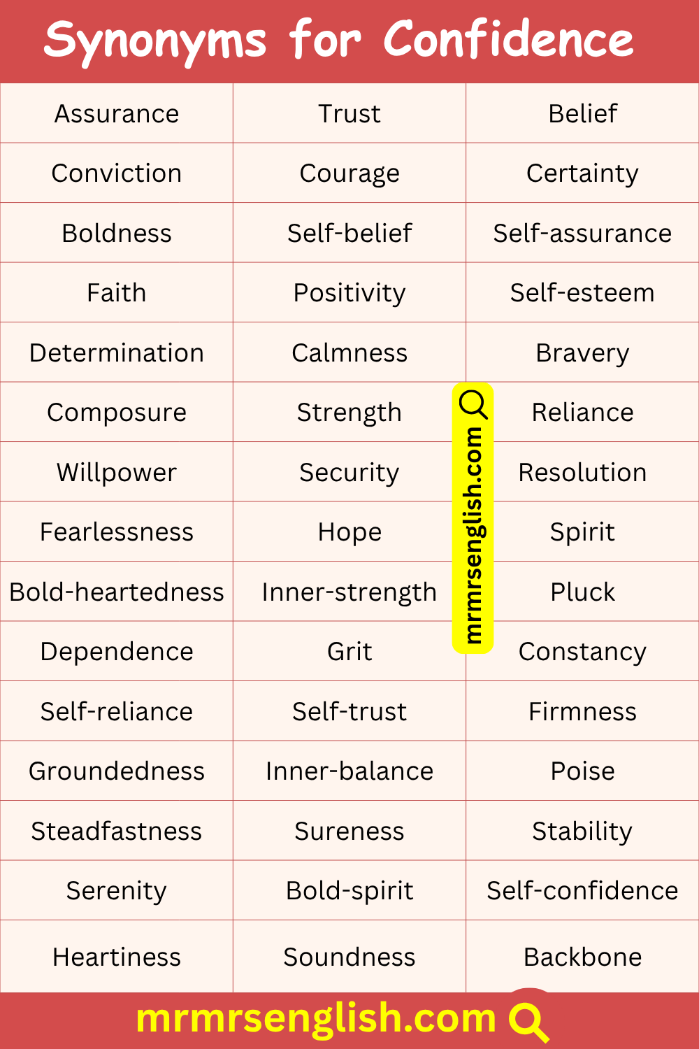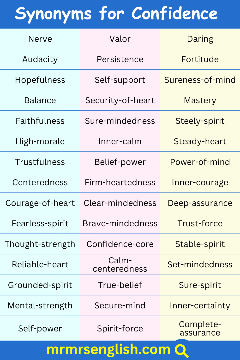 “Confidence” refers to the feeling or belief that one can rely on someone or something, or trust in one’s abilities. It includes self-assurance, certainty, and trust in actions, decisions, or outcomes. Confidence is essential for success, communication, and personal growth.
