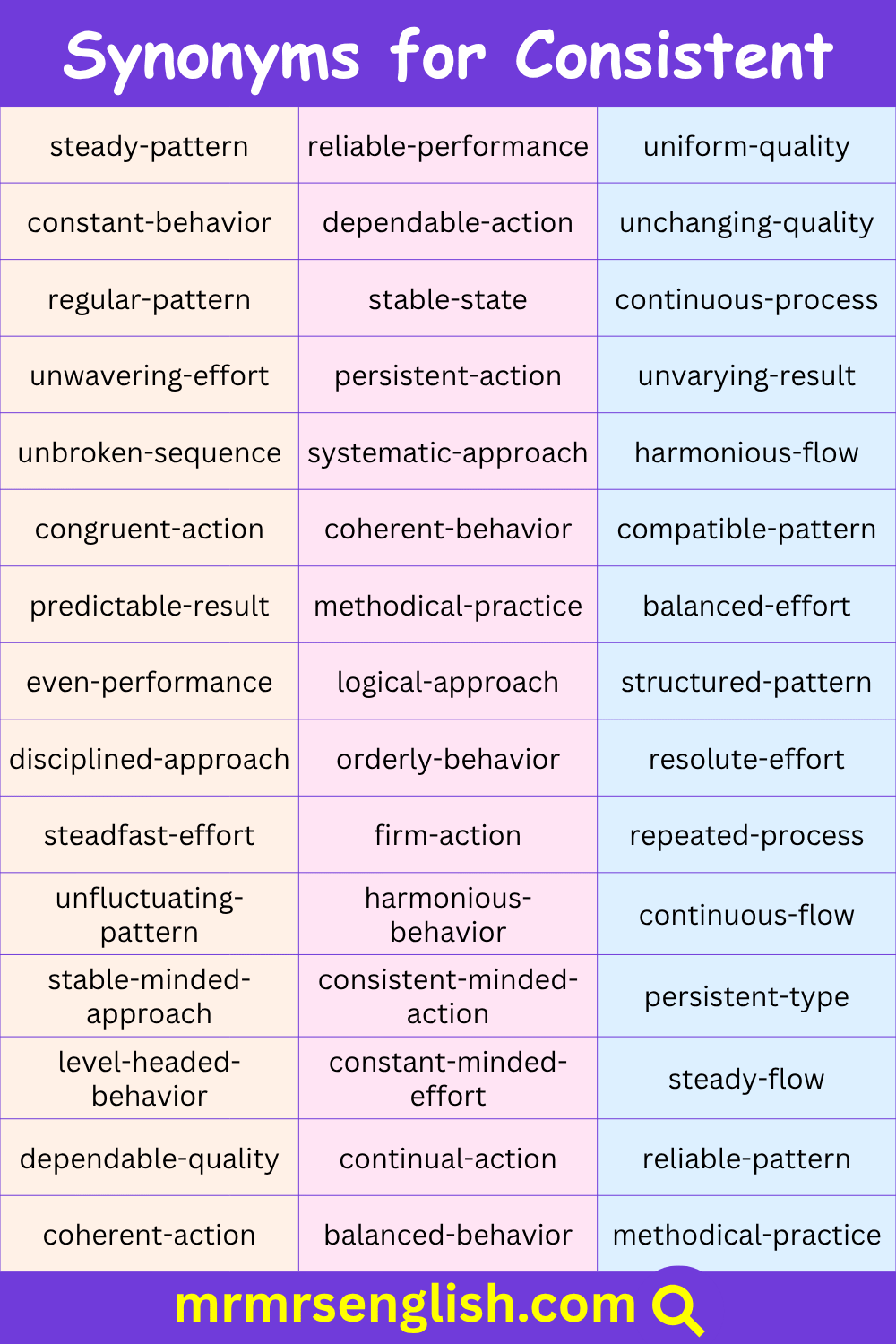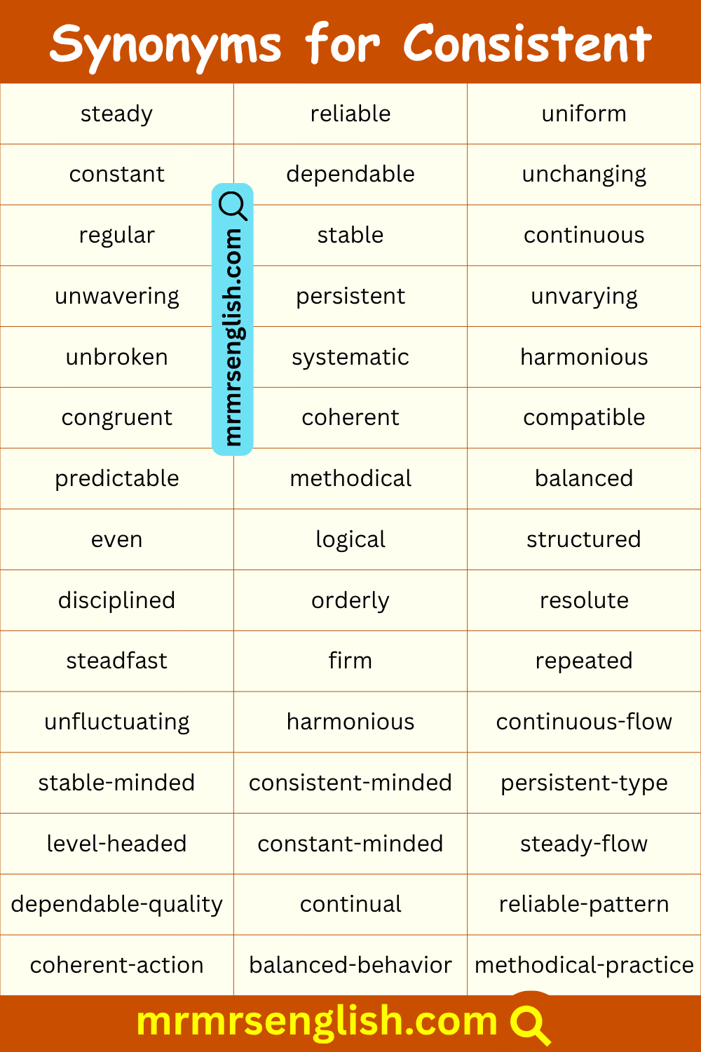 Understanding the word “consistent” is important because it describes something that is steady, reliable, or unchanging over time. In daily English, it is used to talk about behavior, performance, or results that remain dependable and predictable. Learning 100 synonyms for consistent in English with pictures helps you express reliability, stability, and uniformity more effectively, improving communication and clarity. Visual examples make learning easy and enjoyable.