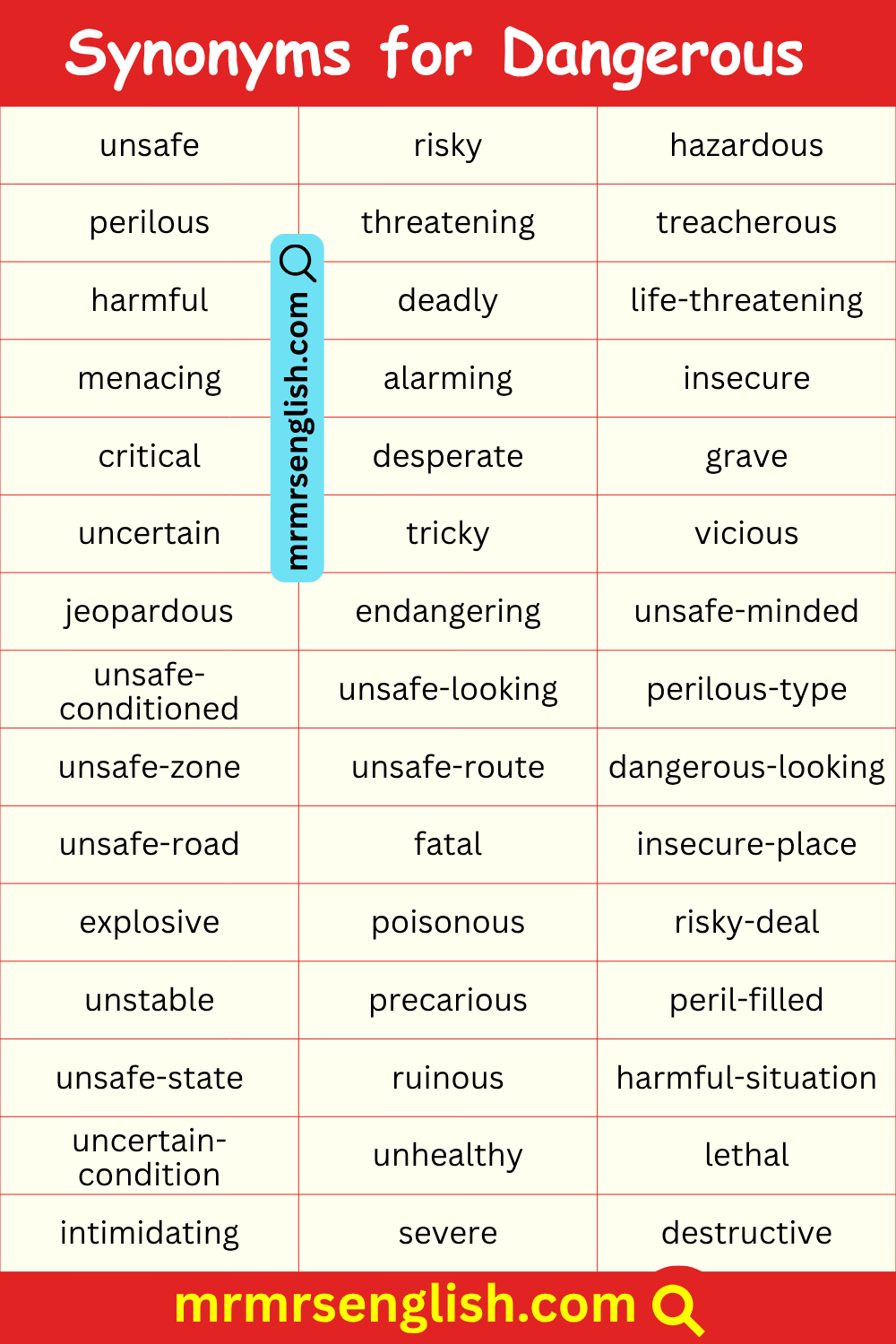 Understanding different ways to describe something dangerous helps us express ourselves more clearly in both speaking and writing. When we know strong and accurate words, we can explain risks, warn others, and communicate situations more effectively. In this article, you will learn 100 Synonyms for Dangerous in English with their Pictures, all explained in simple and easy language. This guide will help students, teachers, and English learners build a richer vocabulary that is useful in daily life, stories, conversations, and exams. Each synonym is presented in a friendly way to make learning smooth, natural, and enjoyable.
