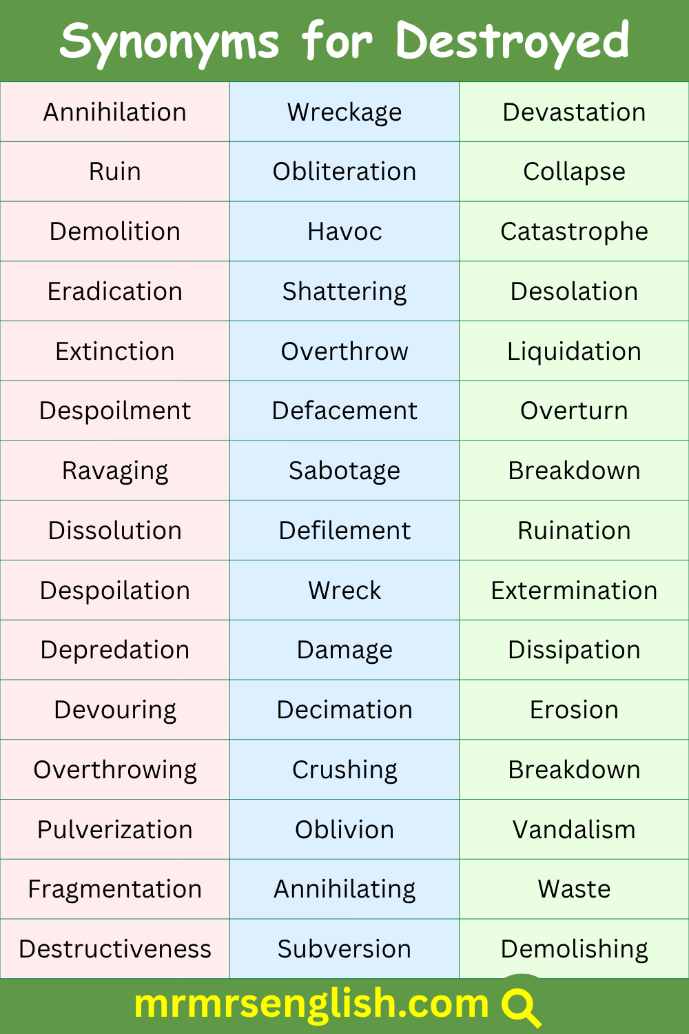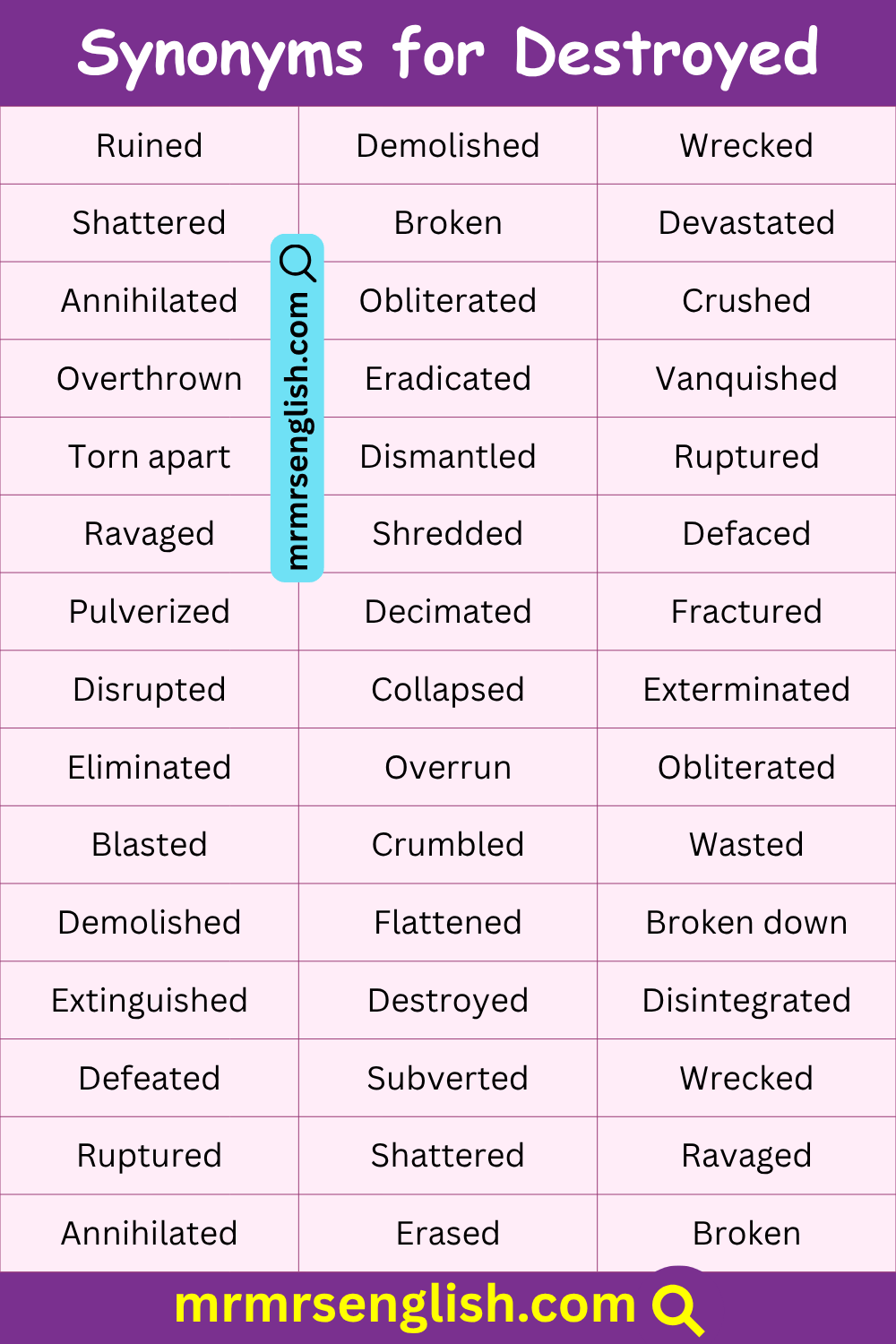 List of Synonyms for Destroyed in English
