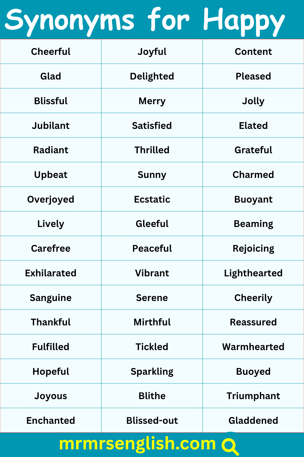 The word “happy” is often used to express joy, pleasure, or a positive feeling. But repeating the same word again and again can make your language sound simple. Learning different synonyms for “happy” helps you express emotions in a more natural, rich, and creative way. Each synonym gives a slightly different shade of meaning, which makes your speech and writing more powerful. In this article, we have shared useful synonyms for happy in English with pictures to make learning easy and enjoyable. This guide is perfect for students, writers, and English learners who want to build a stronger and more expressive vocabulary.