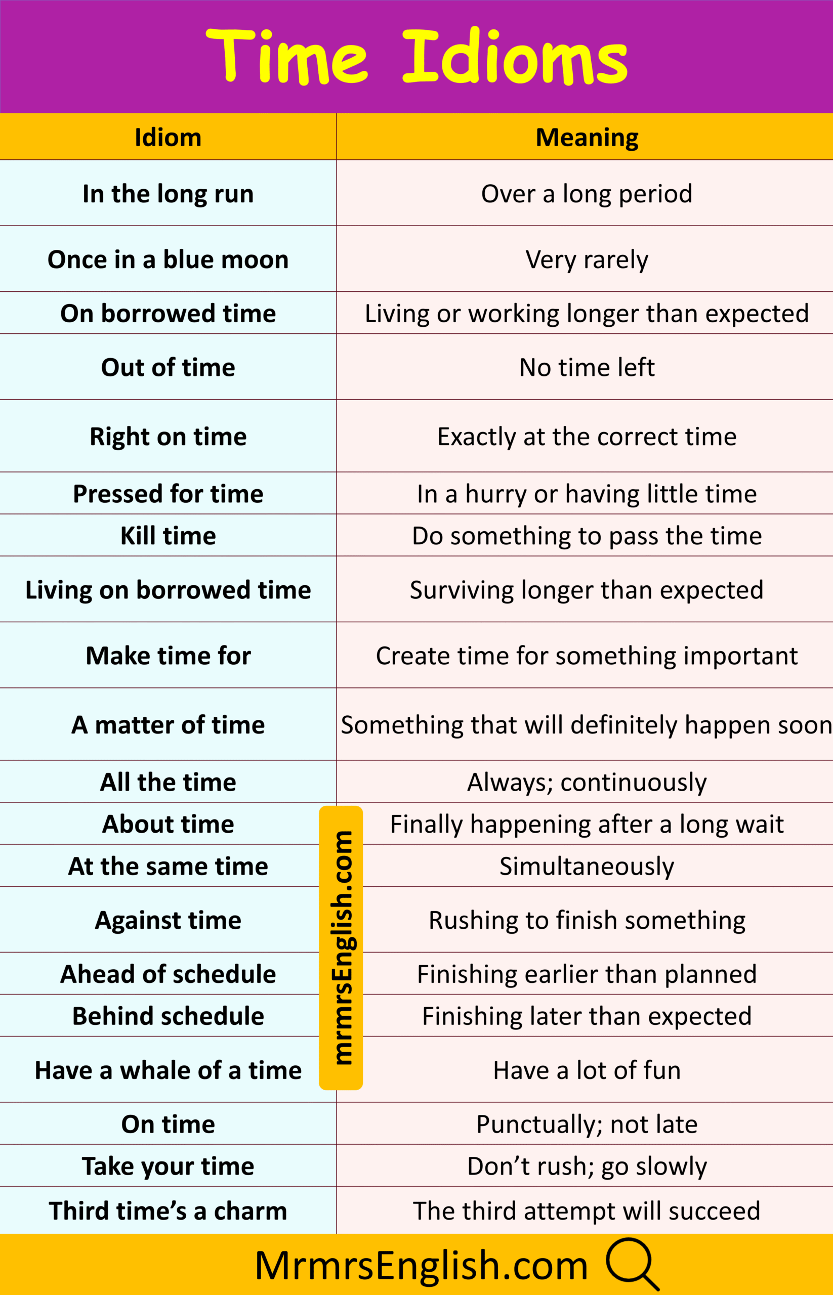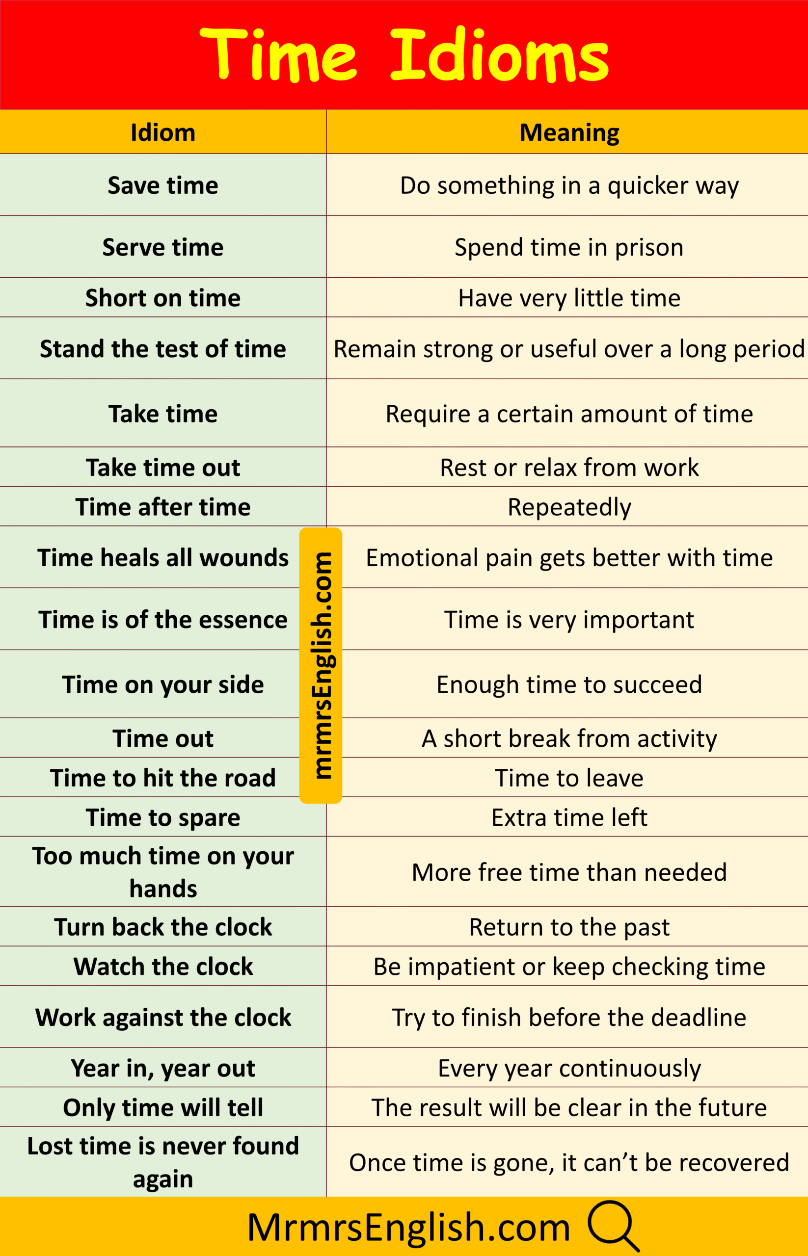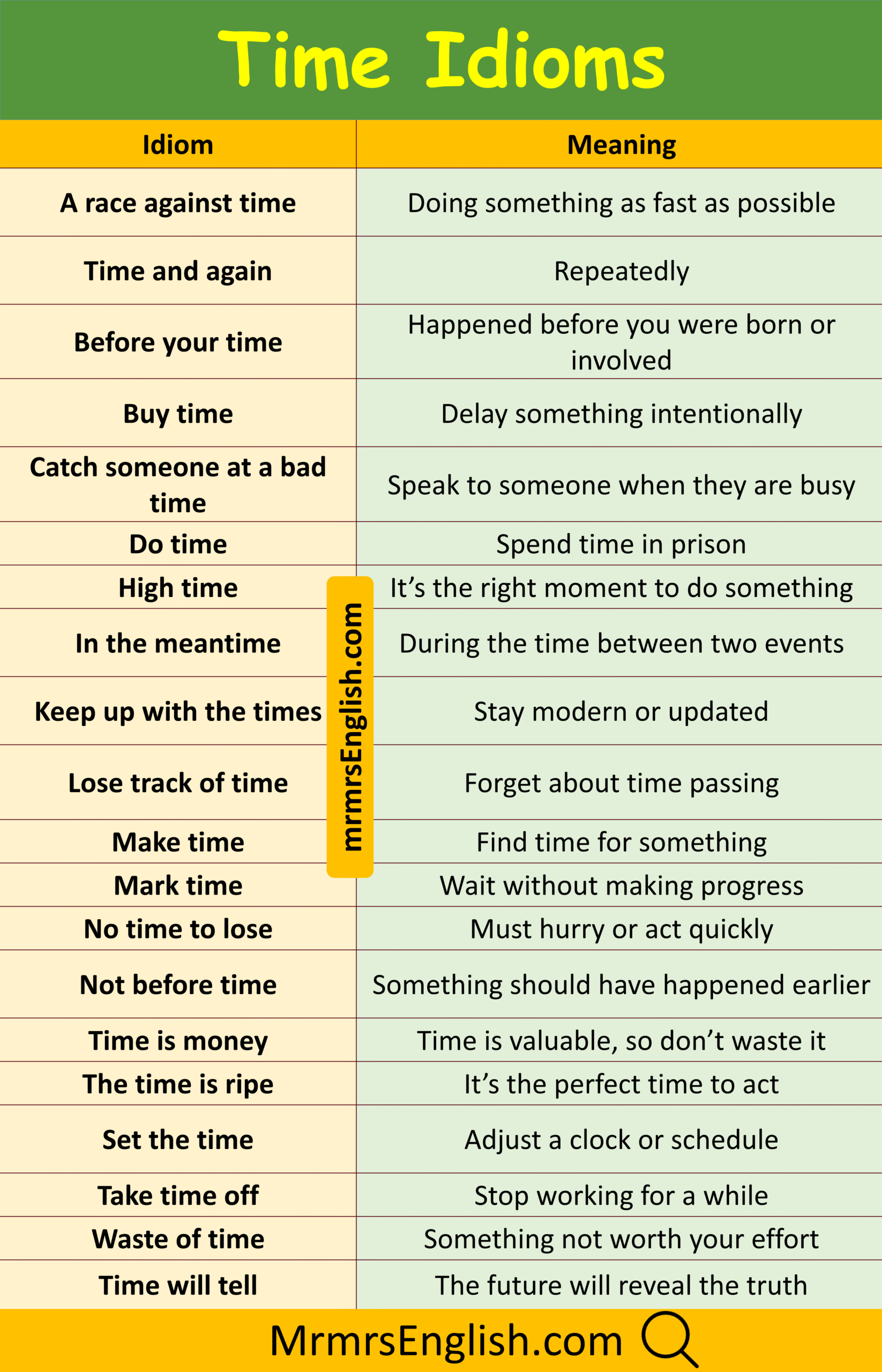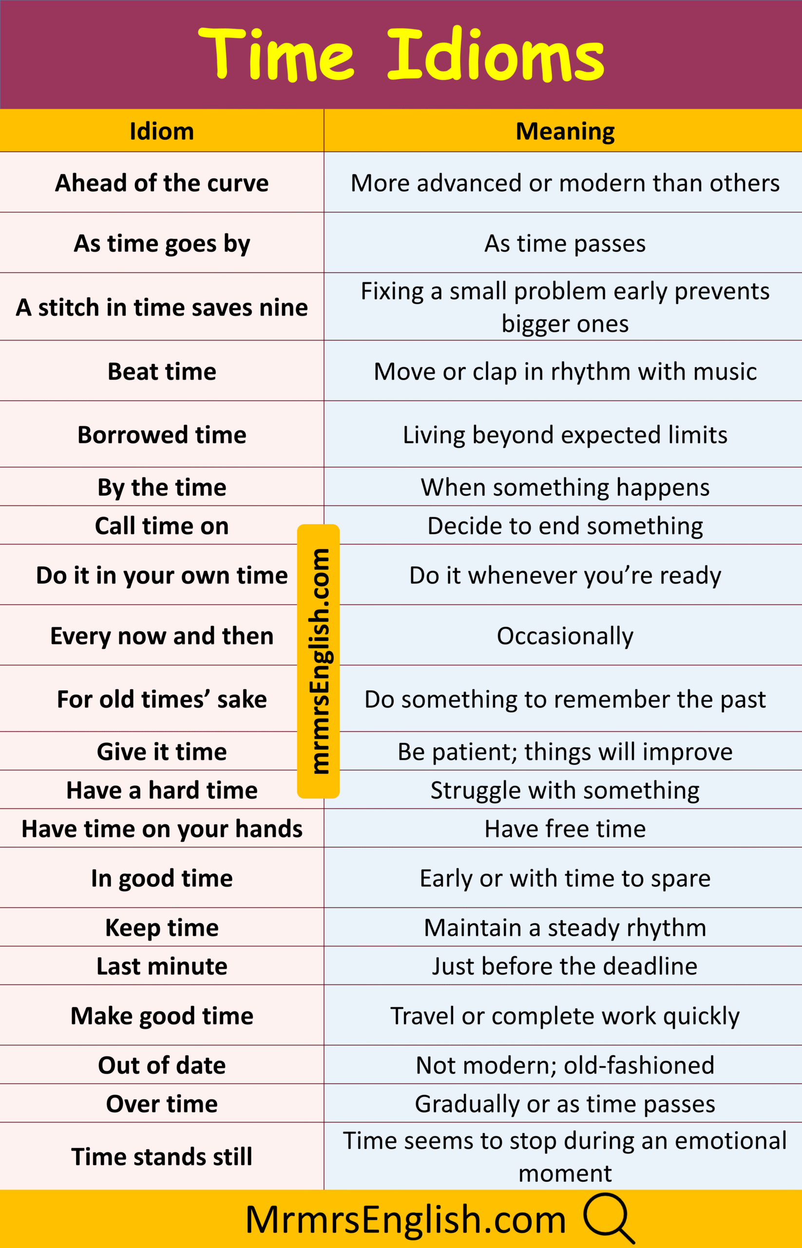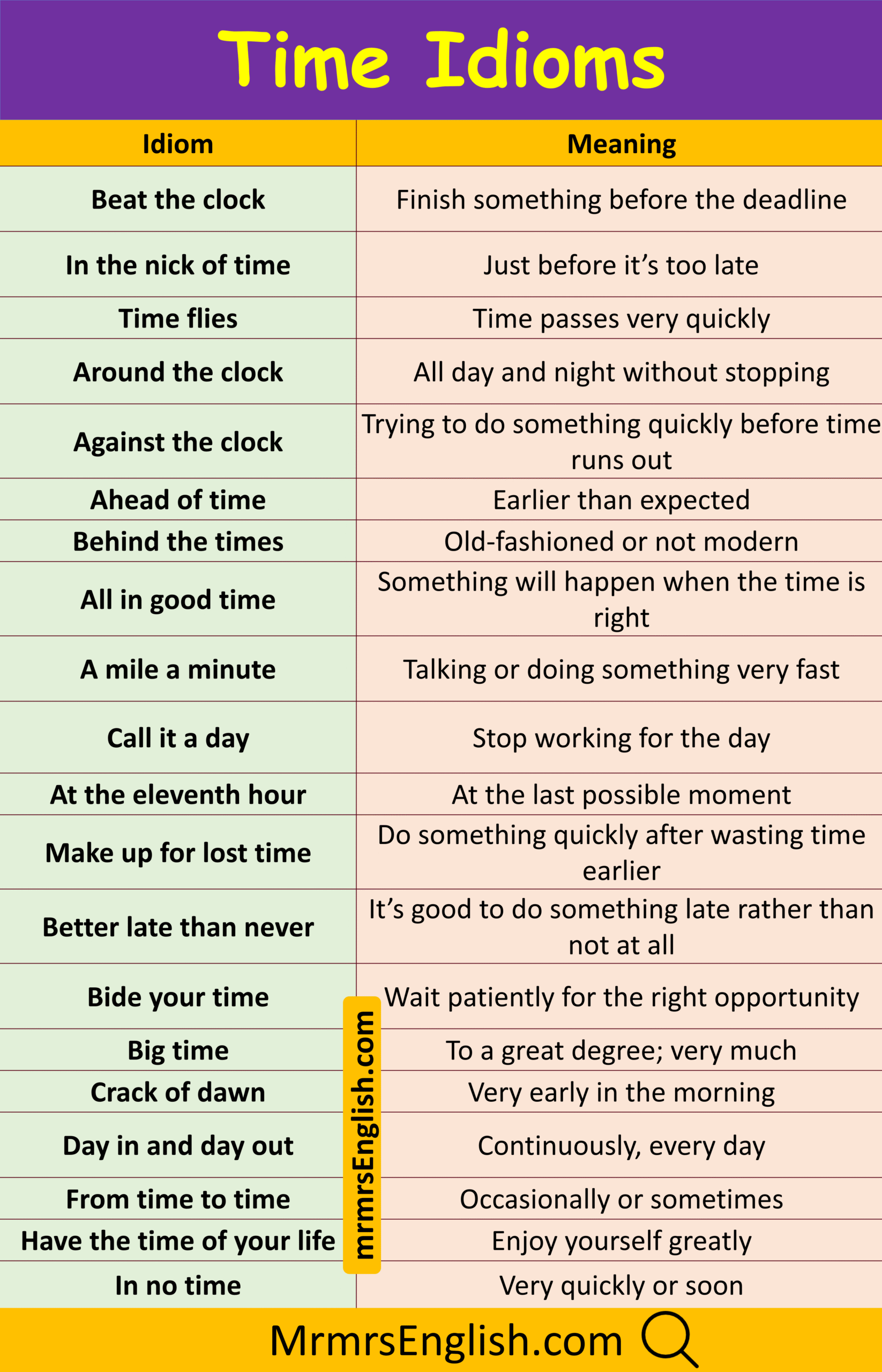 Time idioms are common and creative expressions that use the idea of time to describe different situations, feelings, or actions in everyday life. These idioms don’t always talk about the actual time on a clock but carry deeper meanings that make English sound more natural and expressive. Learning time idioms helps students understand conversations better and speak more fluently. In this article, you will learn some popular time idioms in English with their meanings and pictures. These useful expressions will make your vocabulary stronger and your speech more lively and confident.