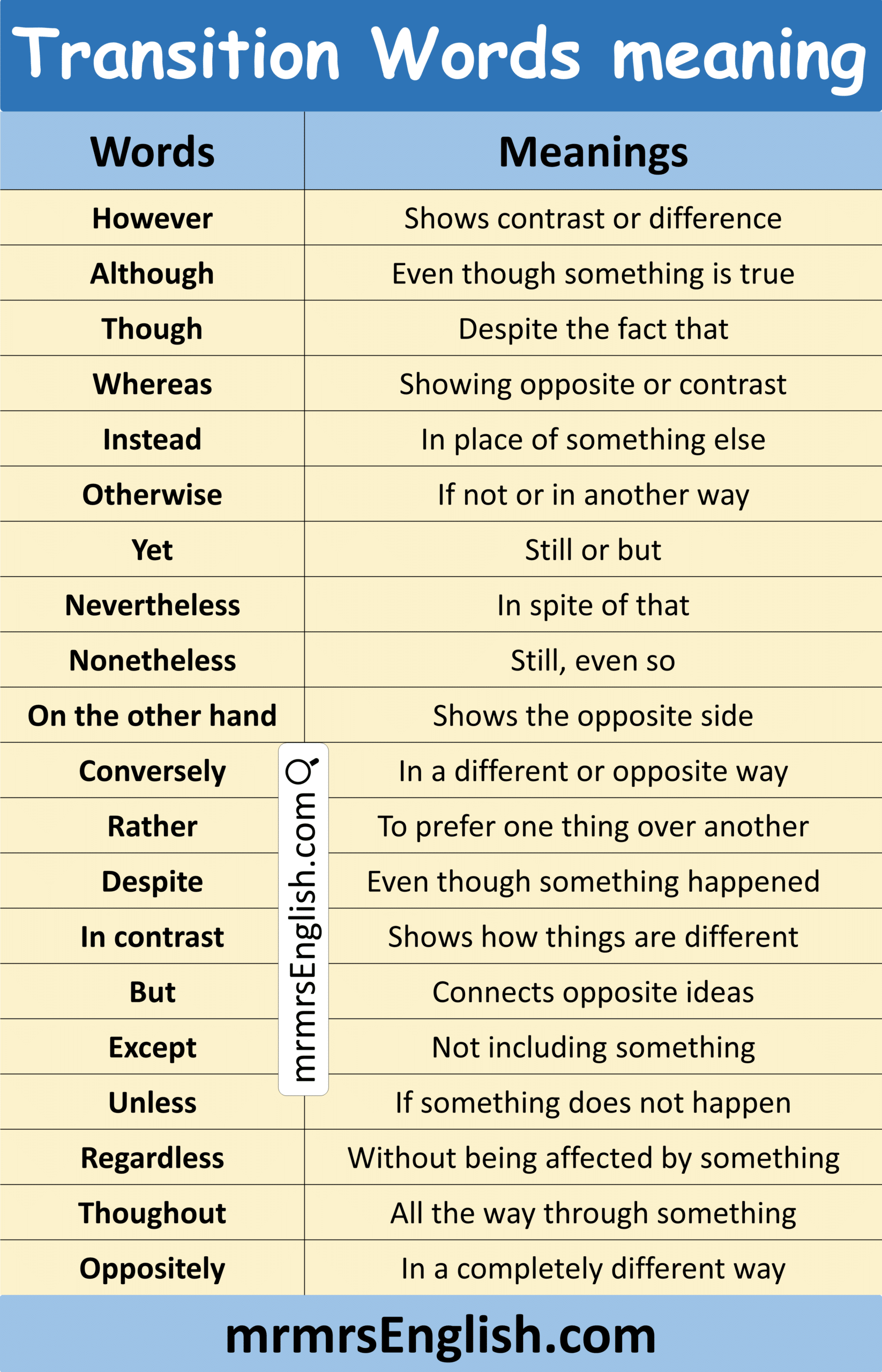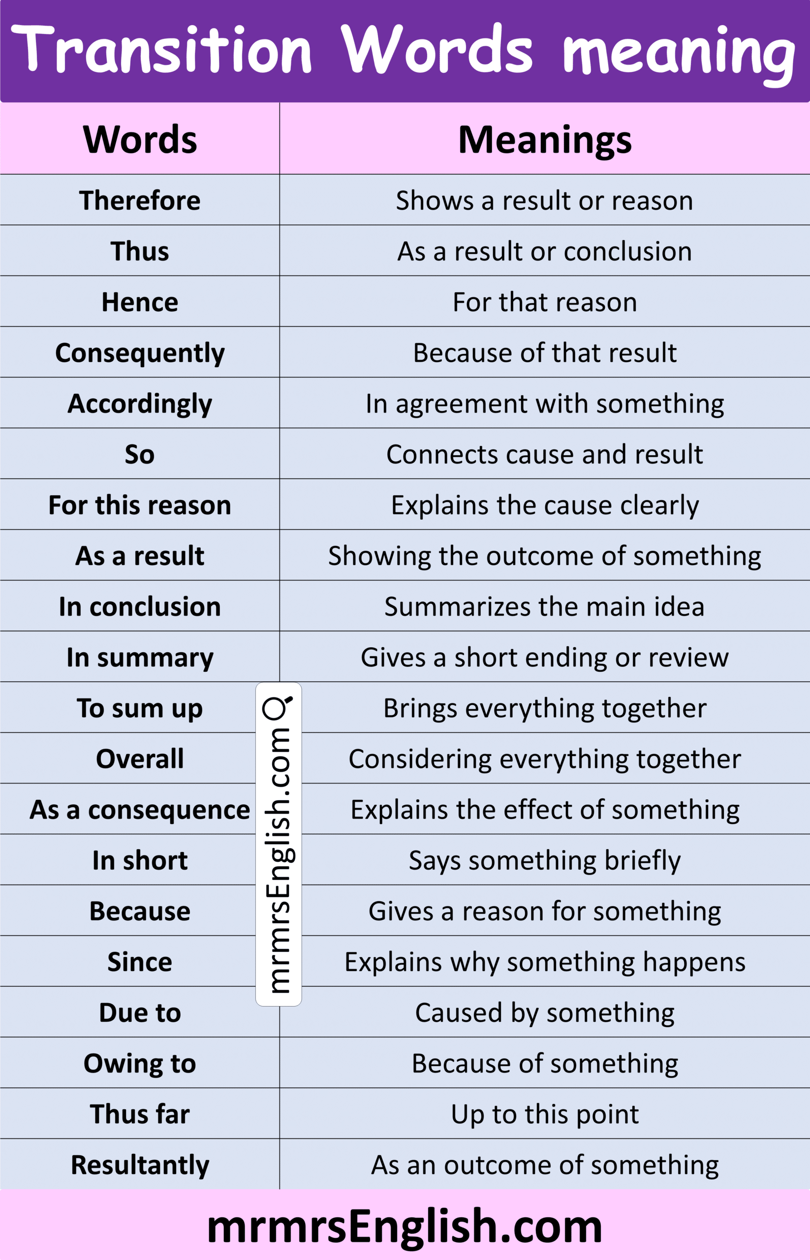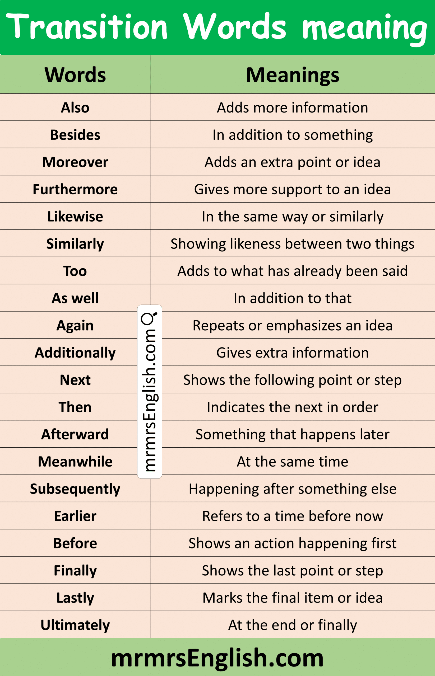 Transition words play a very important role in English writing and speaking. They help connect ideas smoothly and make sentences sound clear and logical. Words like however, therefore, in addition, and finally guide the reader or listener from one thought to another. In this article, you will learn 100 transition words with their meanings in English and pictures to understand how they are used in sentences. These words will help you improve your writing, make your conversations more fluent, and give your English a more professional and natural flow.
