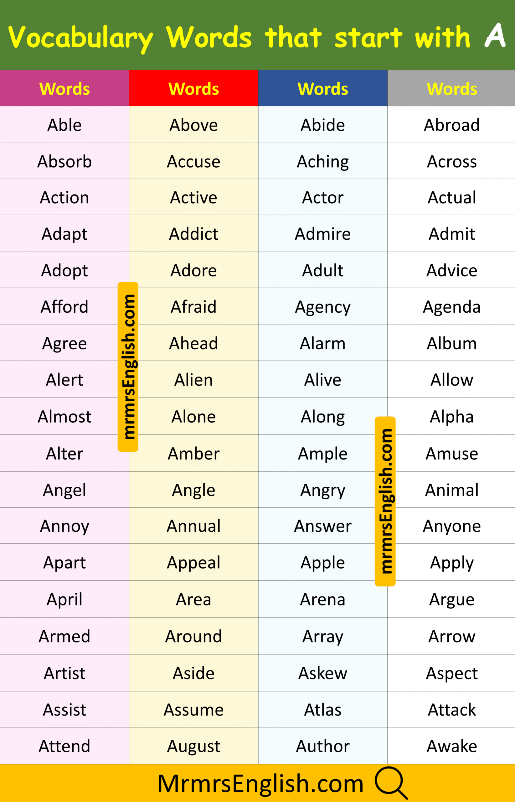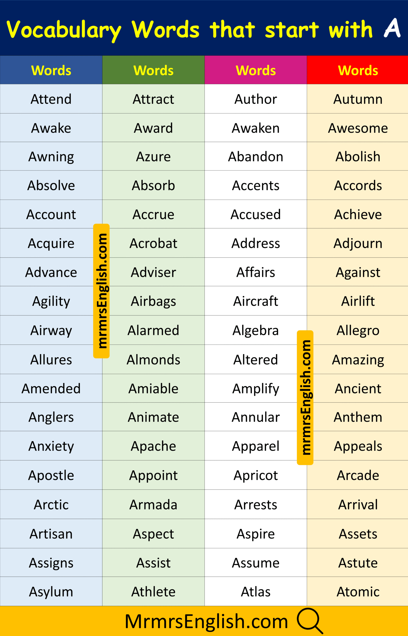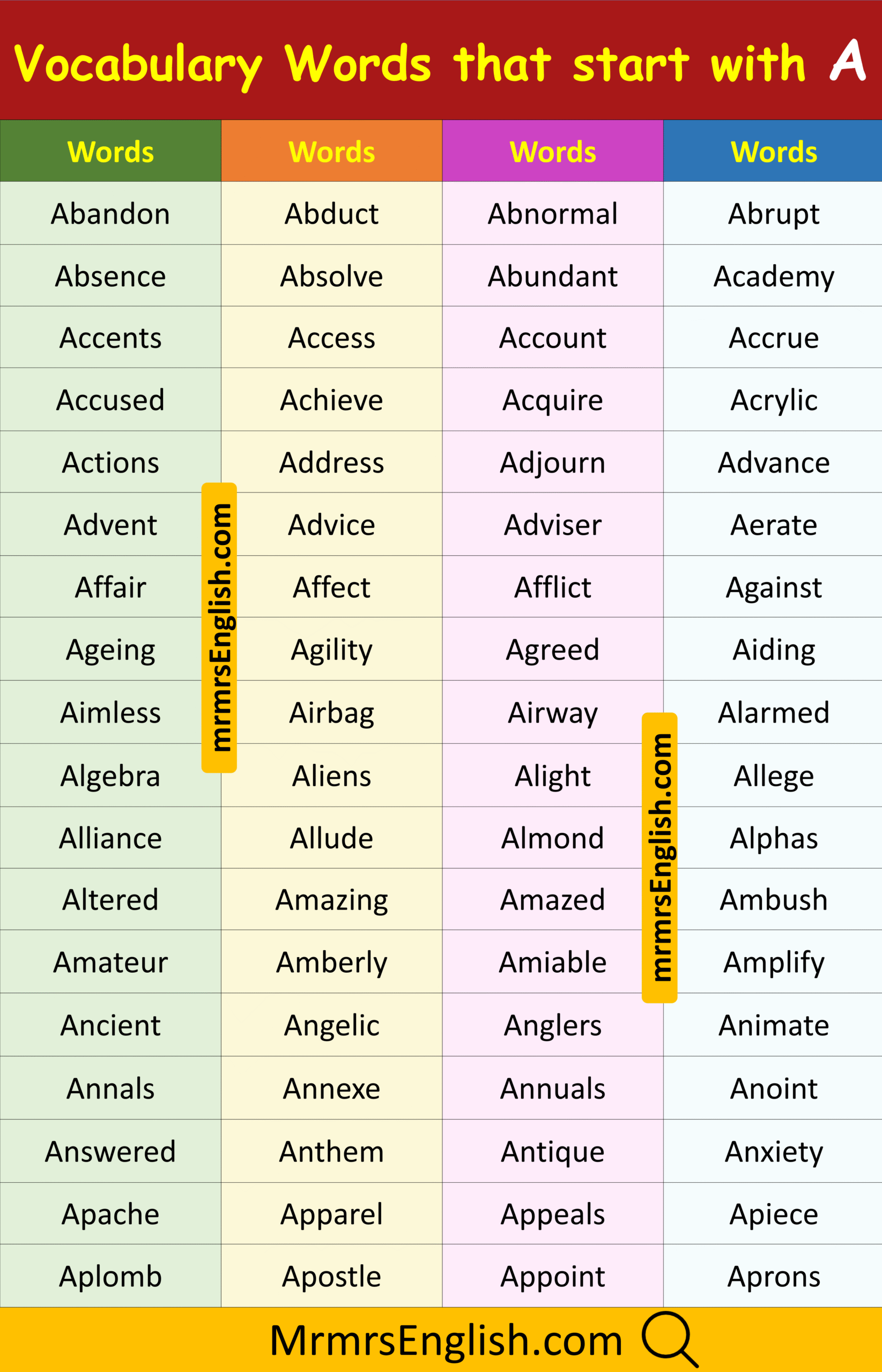 Learn Vocabulary Words that Start with A in English