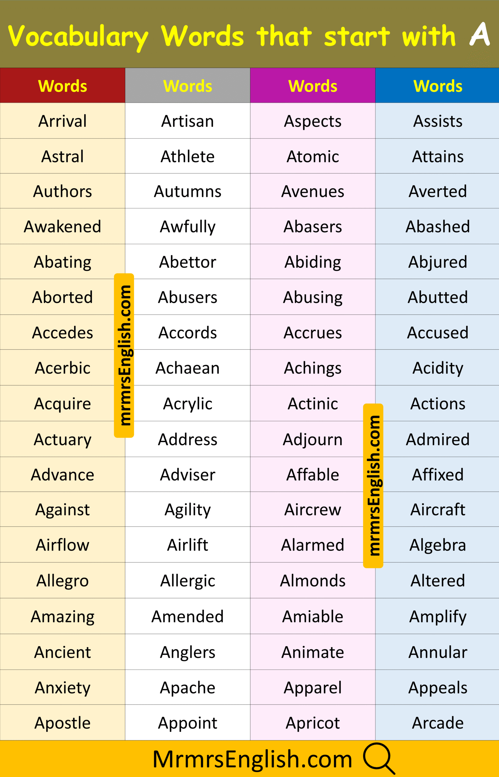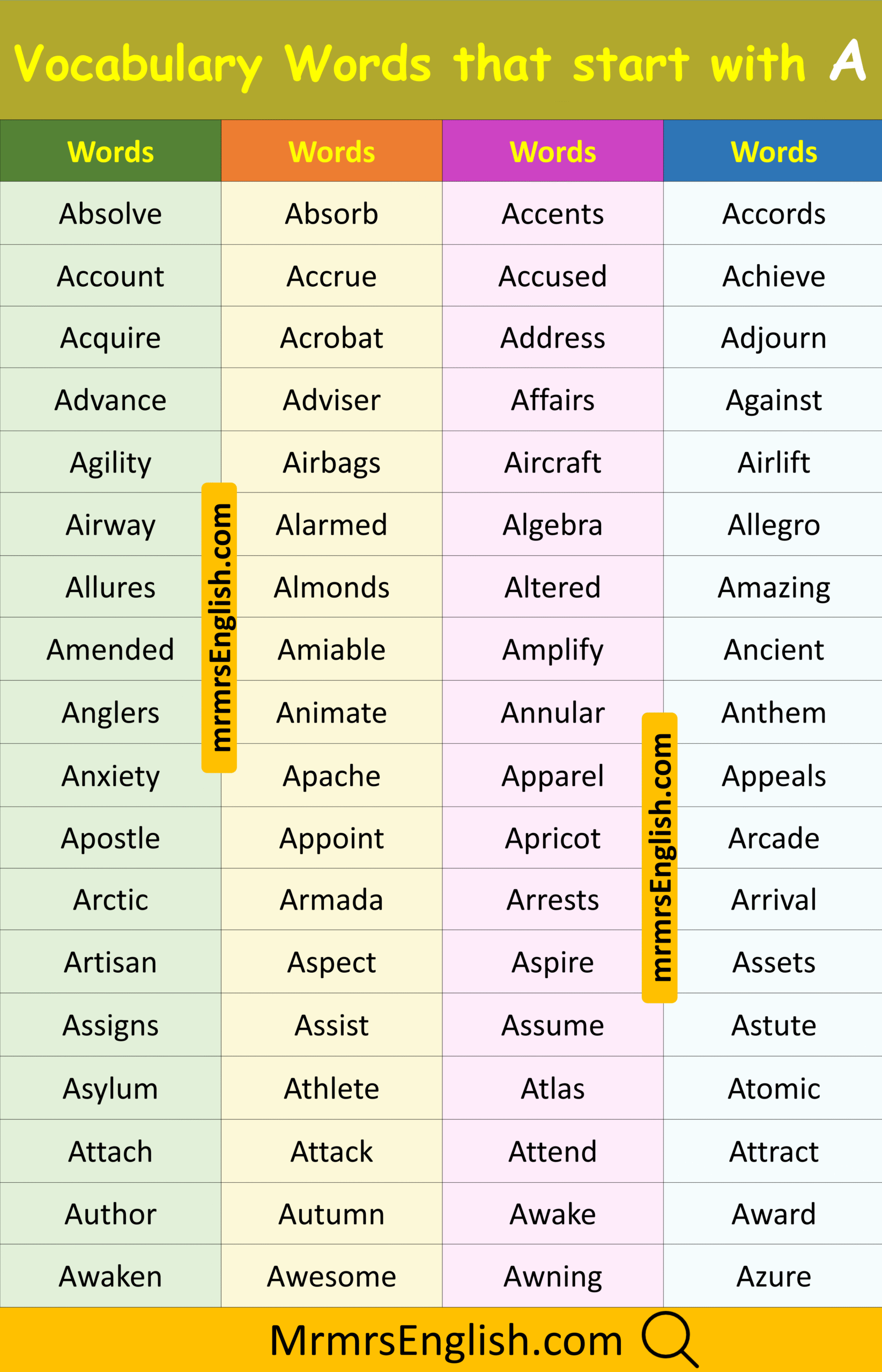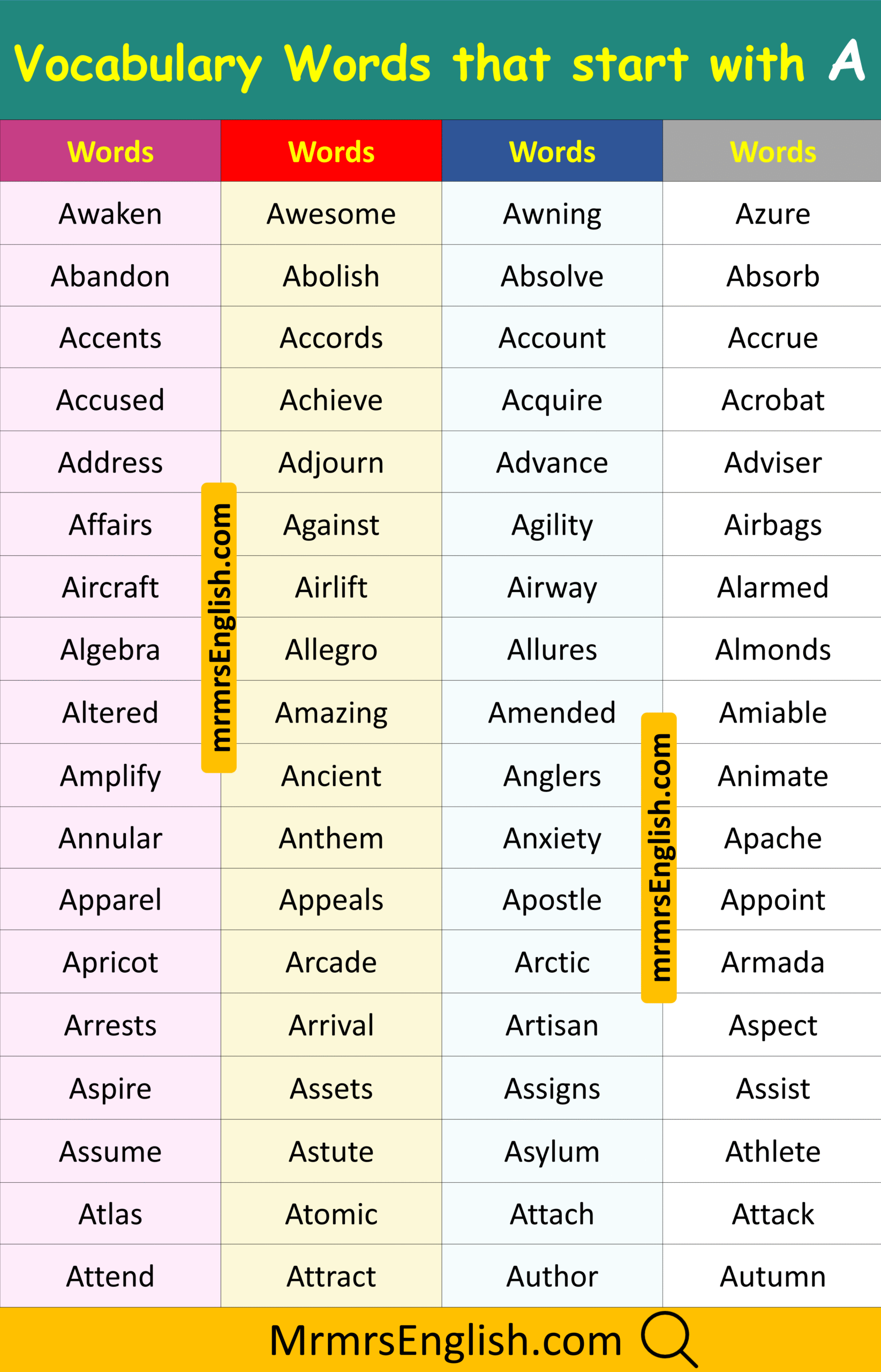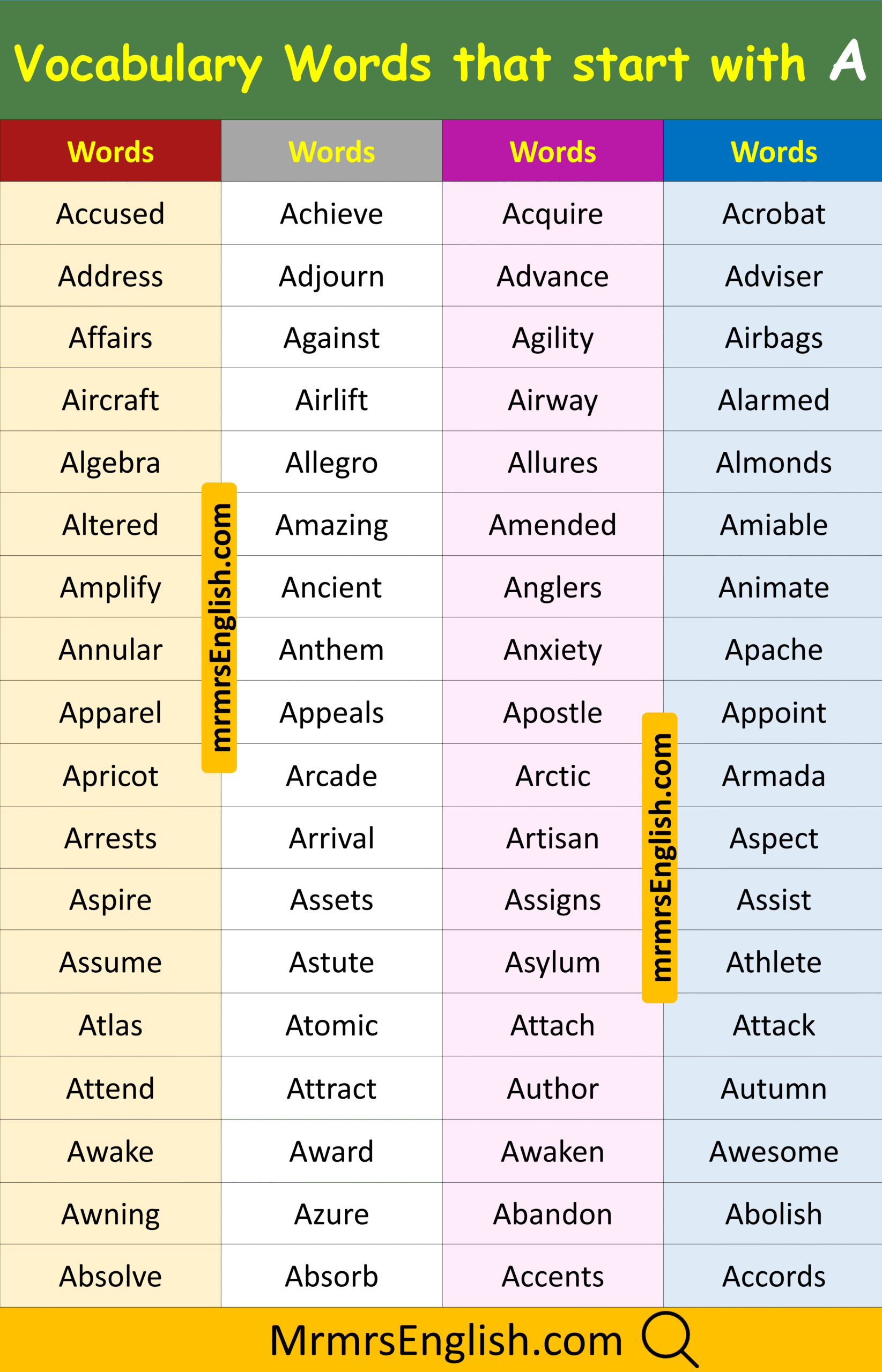 Vocabulary Words that Start with A in English