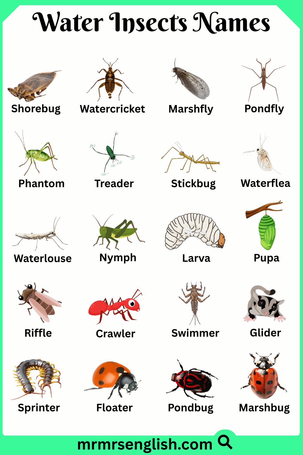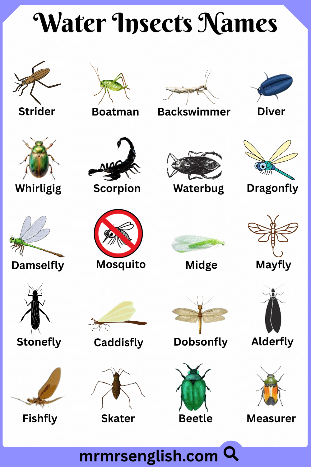 Water insects are small creatures that live on the surface of water or inside ponds, lakes, rivers, and wetlands. These insects play an important role in nature because they help keep the water ecosystem balanced and also serve as food for fish, birds, and other animals. Some water insects can swim, while others walk on the water surface or hide among plants. Common examples include water striders, dragonflies, damselflies, and diving beetles. In this article, you will learn the names of different water insects in English along with their pictures, which will help you recognize them easily and improve your English vocabulary.