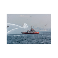 A boat equipped with water cannons to fight fires near docks or on ships.