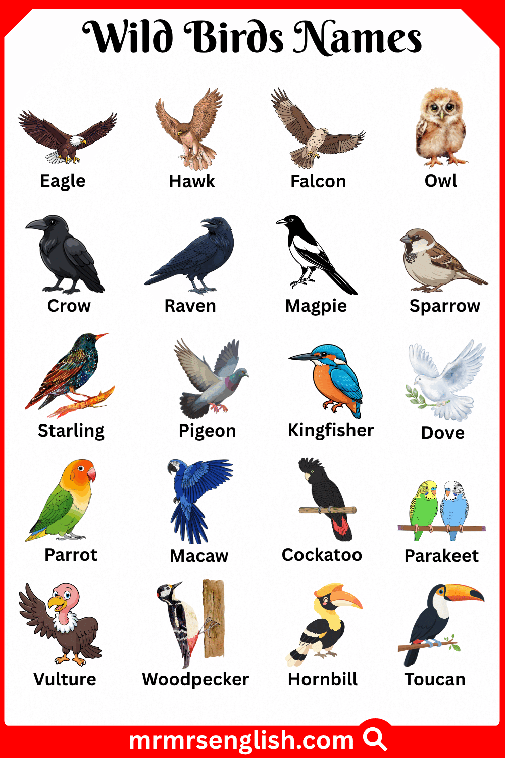 Wild birds are beautiful creatures that live freely in forests, mountains, riversides, and open fields. They build their nests in nature and survive by finding their own food, such as insects, seeds, fruits, and small animals. Many wild birds are known for their colorful feathers, unique sounds, and amazing flying abilities. In this article, you will learn wild birds names in English with their pictures, which will help children and beginners easily recognize different birds and remember their names. This simple guide makes learning fun while helping students improve their English vocabulary and understand more about birds found in nature.