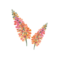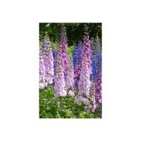 A delicate flower with tall spikes of purple, yellow, or pink blooms.