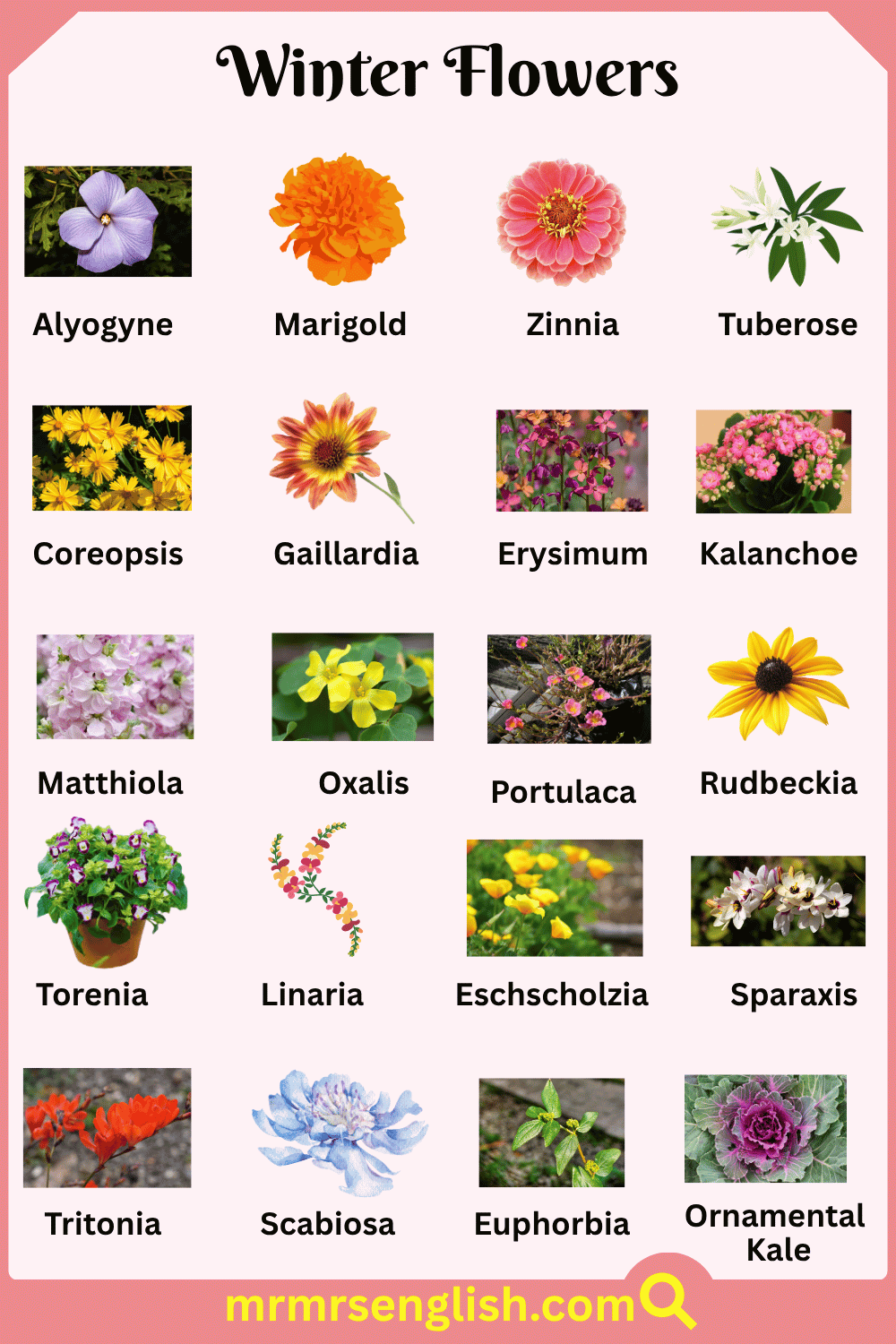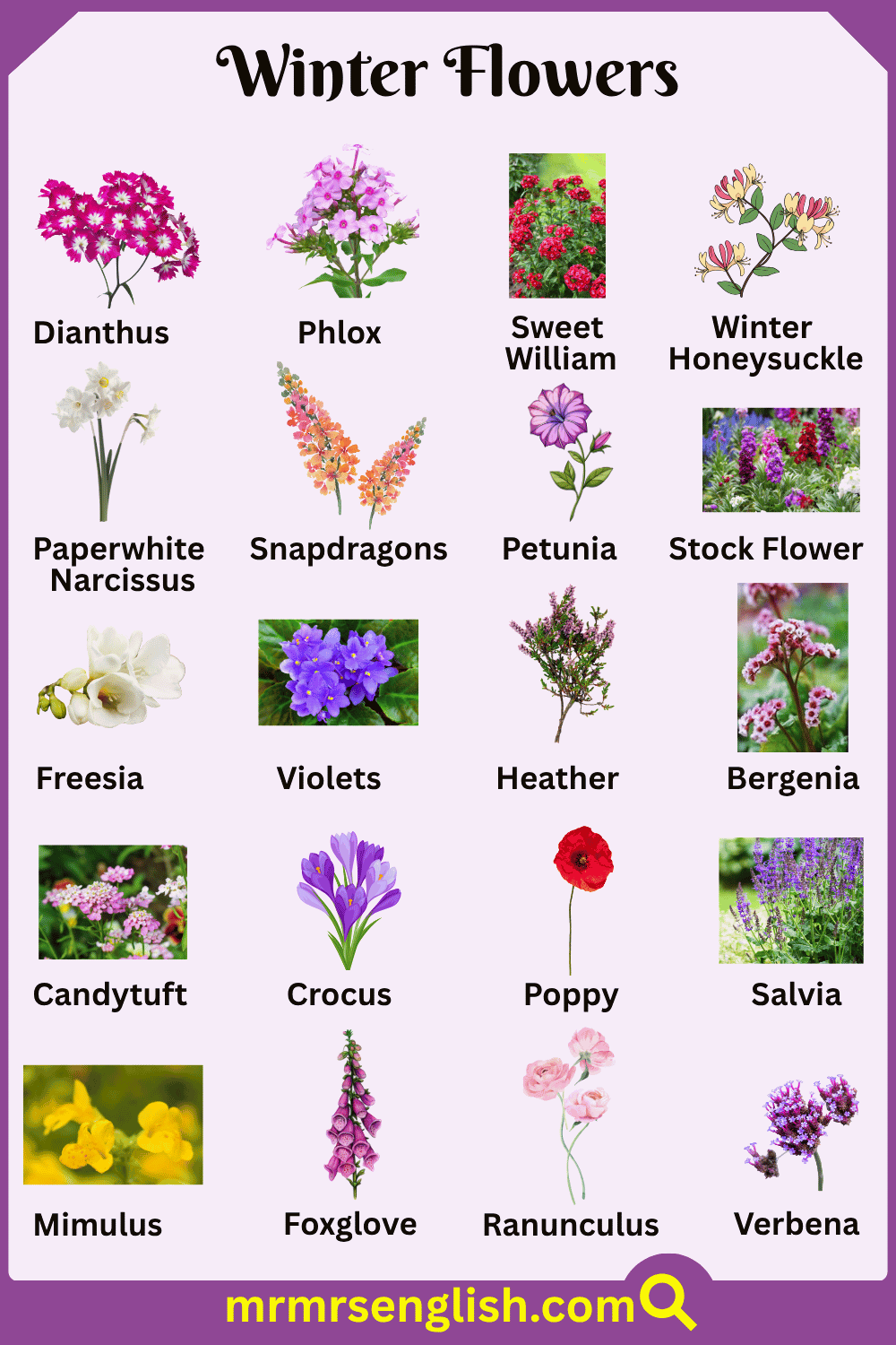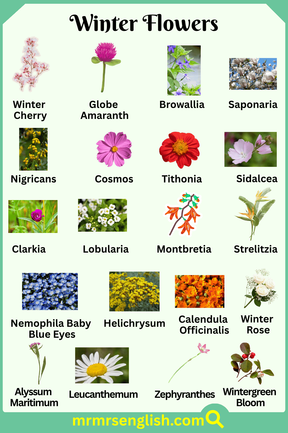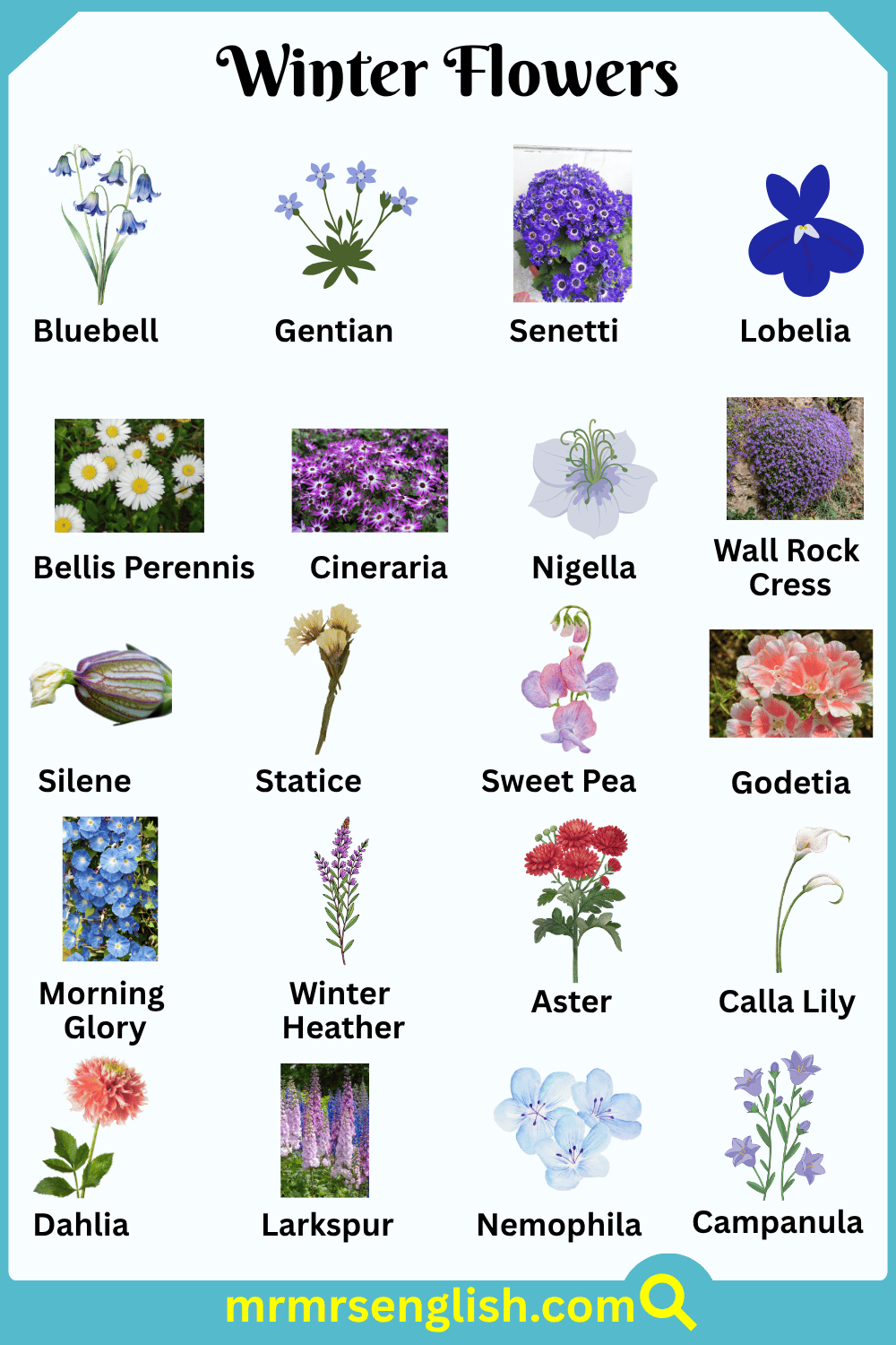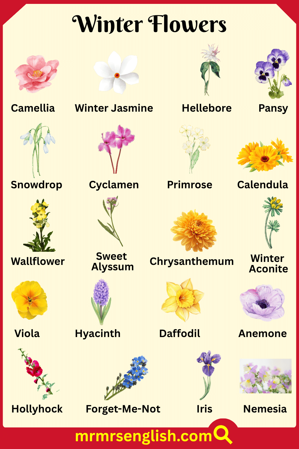 Winter may feel cold and quiet, but it is also a season when many beautiful flowers bloom and bring color to the surroundings. These flowers not only make gardens and homes look bright but also remind us of the beauty of nature even in chilly weather. Each flower has its own name and charm, which makes learning about them both fun and useful. Knowing the names of winter flowers in English helps students, learners, and nature lovers improve their vocabulary while enjoying the wonders of the season. In this article, we will learn the winter flowers names in English with their pictures to make learning simple, clear, and enjoyable.